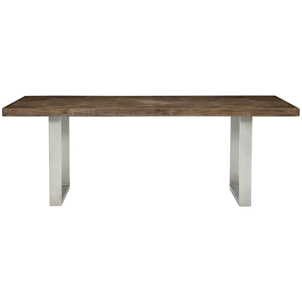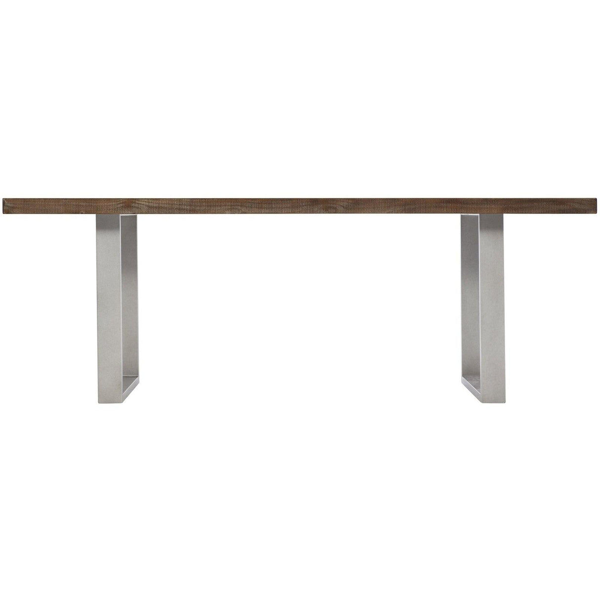 El tablero está fabricado en pino envejecido con un cálido acabado marrón sable que le confiere un carácter rústico. La base cuenta con pedestales abiertos de acero tubular con acabado en gris niebla, que aportan un refinado toque industrial al diseño.