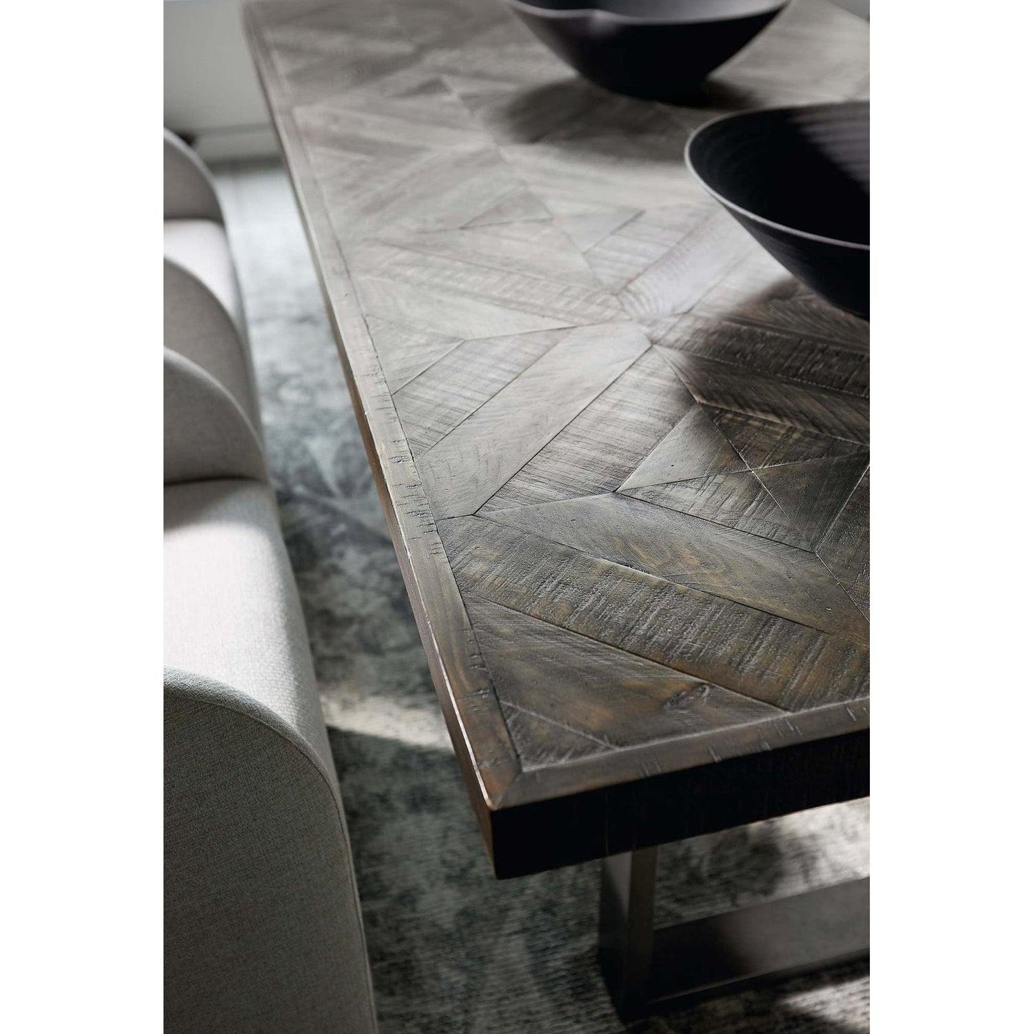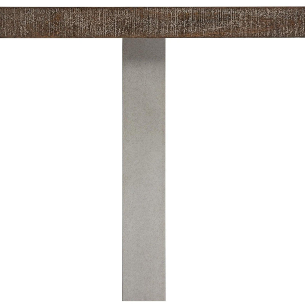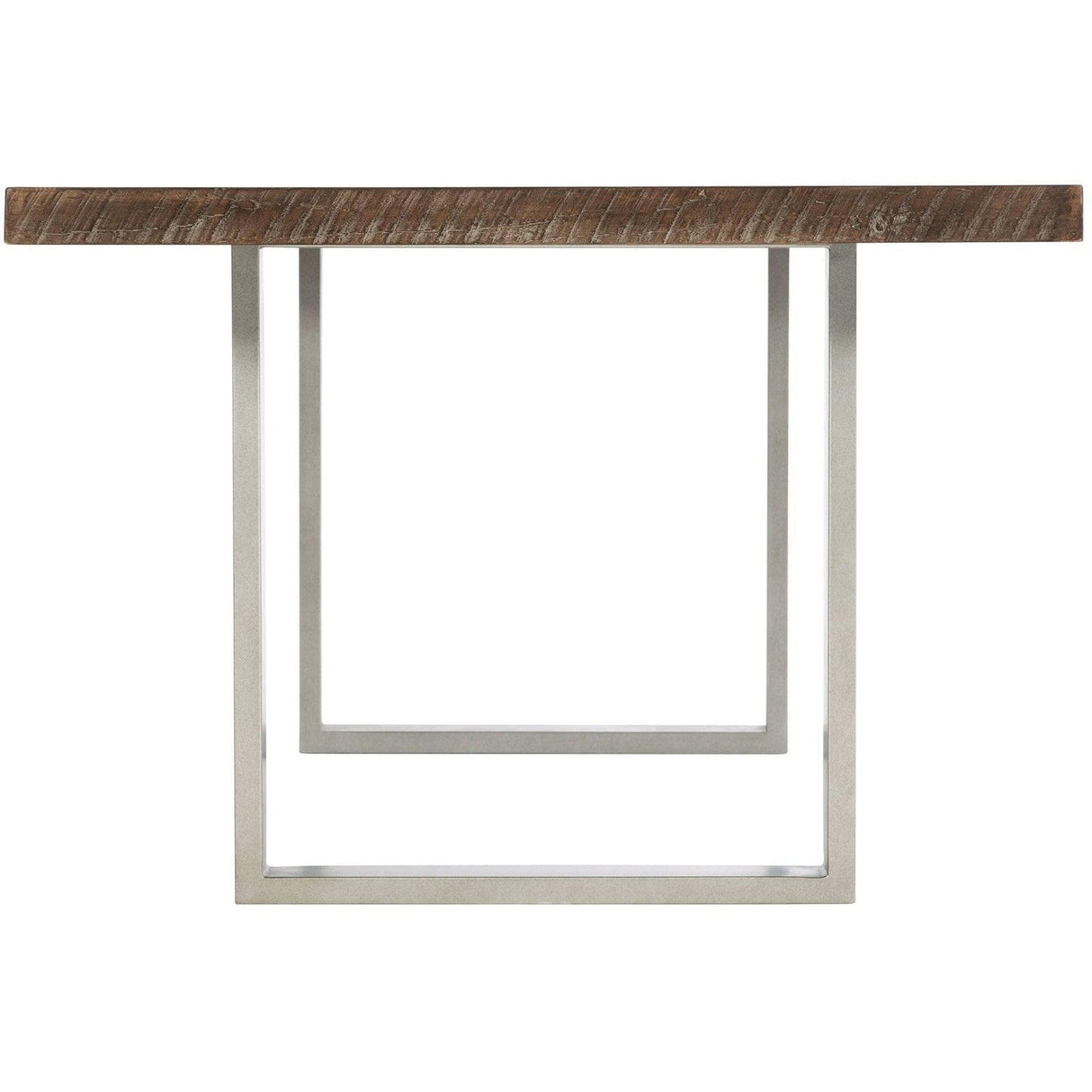 La mesa de comedor Draper de Bernhardt Furniture combina un tablero de pino envejecido con acabado marrón sable y dos pedestales abiertos de acero tubular con acabado gris niebla. Parte de la colección Bernhardt Loft – Logan Square, esta mesa rústica e industrial equilibra la textura natural con la sofisticación arquitectónica, convirtiéndola en la opción ideal para comedores contemporáneos.