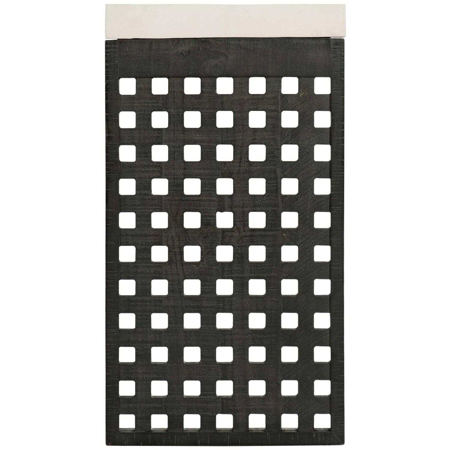 - Base de madera en acabado Cinder con un panel lateral de rejilla abierta y un panel lateral de hormigón fundido en acabado Bone