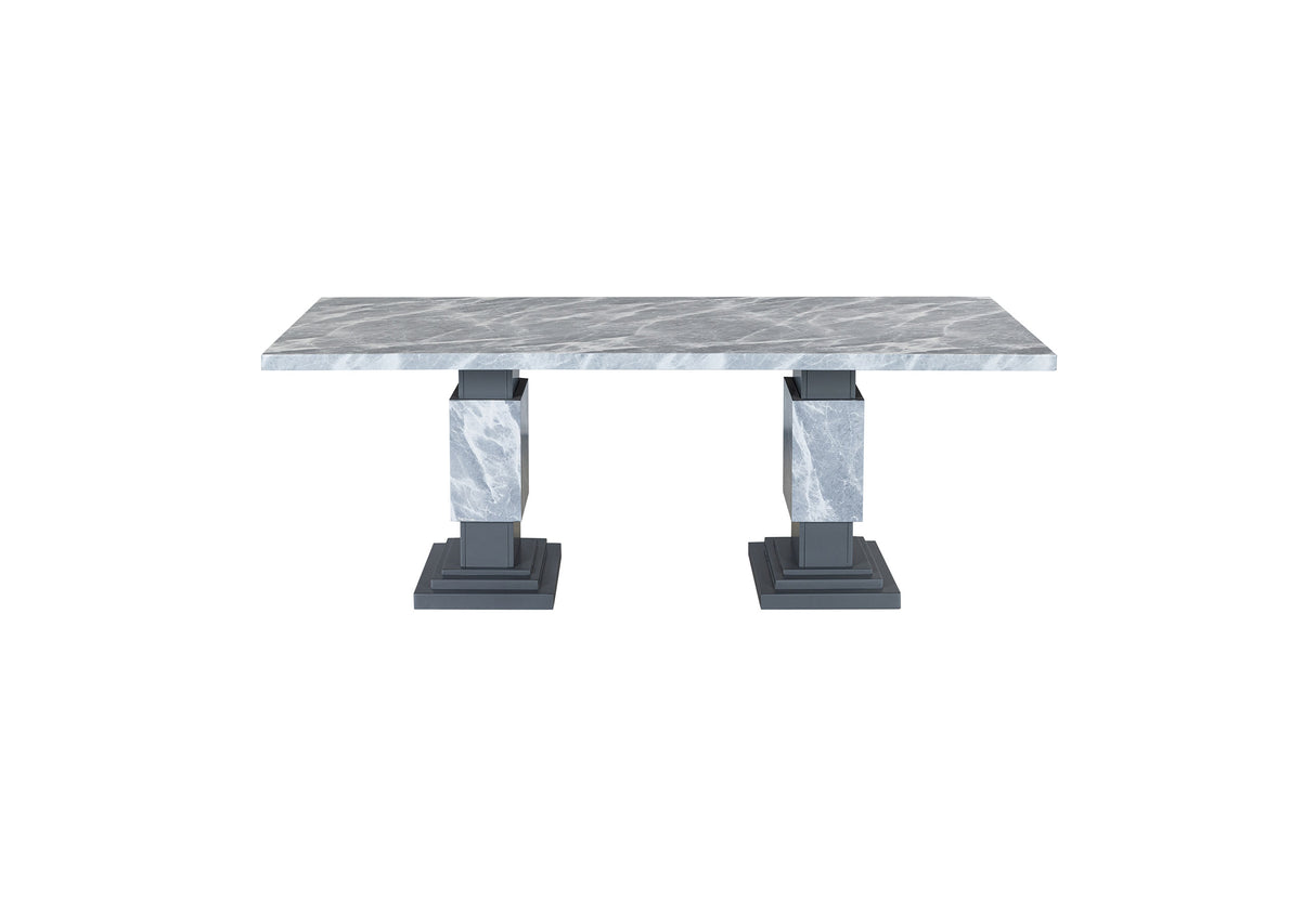 El punto focal de este conjunto es la mesa, con una superficie de imitación mármol que irradia un lujo atemporal. Su elegante base gris con detalles de imitación mármol añade un toque de modernidad y complementa a la perfección cualquier decoración interior. Fabricada con meticulosa atención al detalle, la mesa D1212 ofrece una construcción robusta que garantiza años de uso fiable.