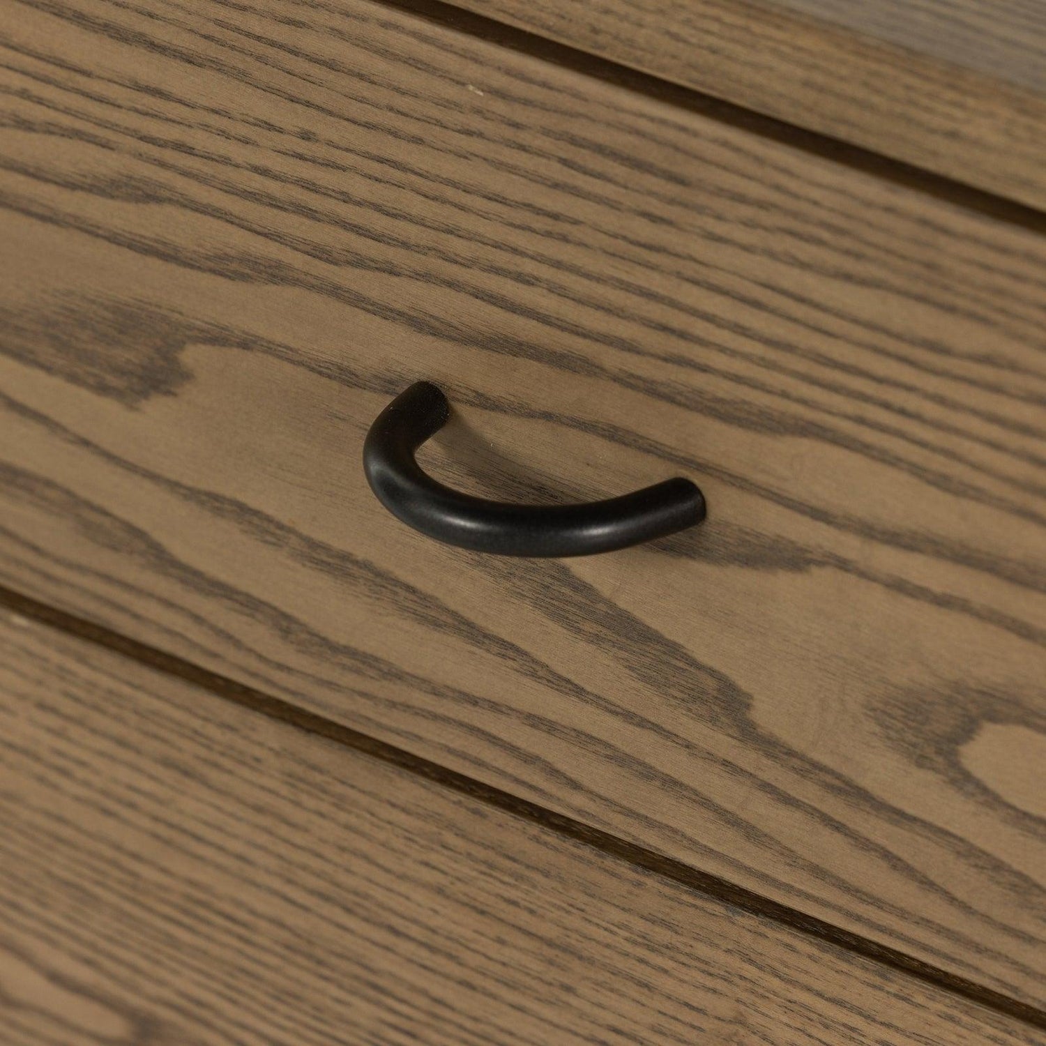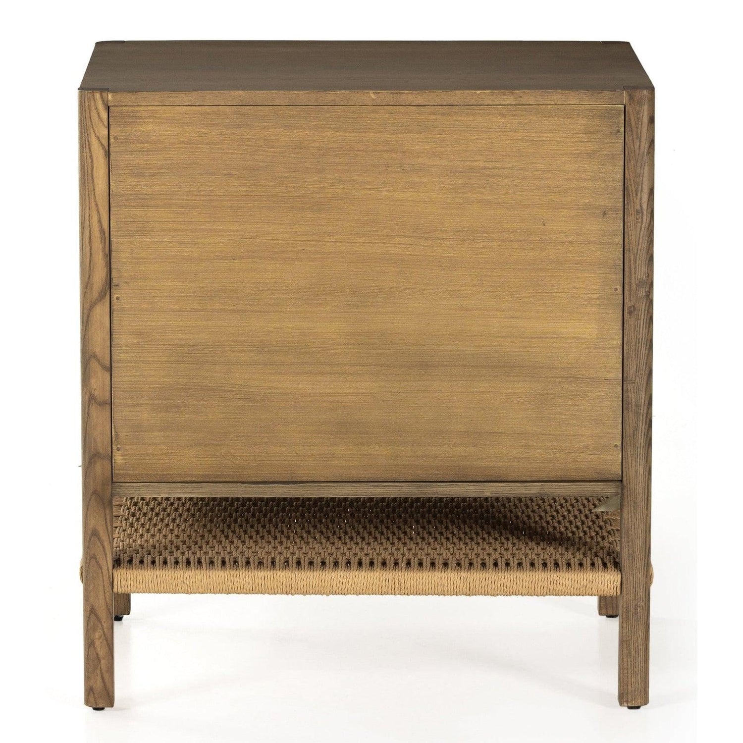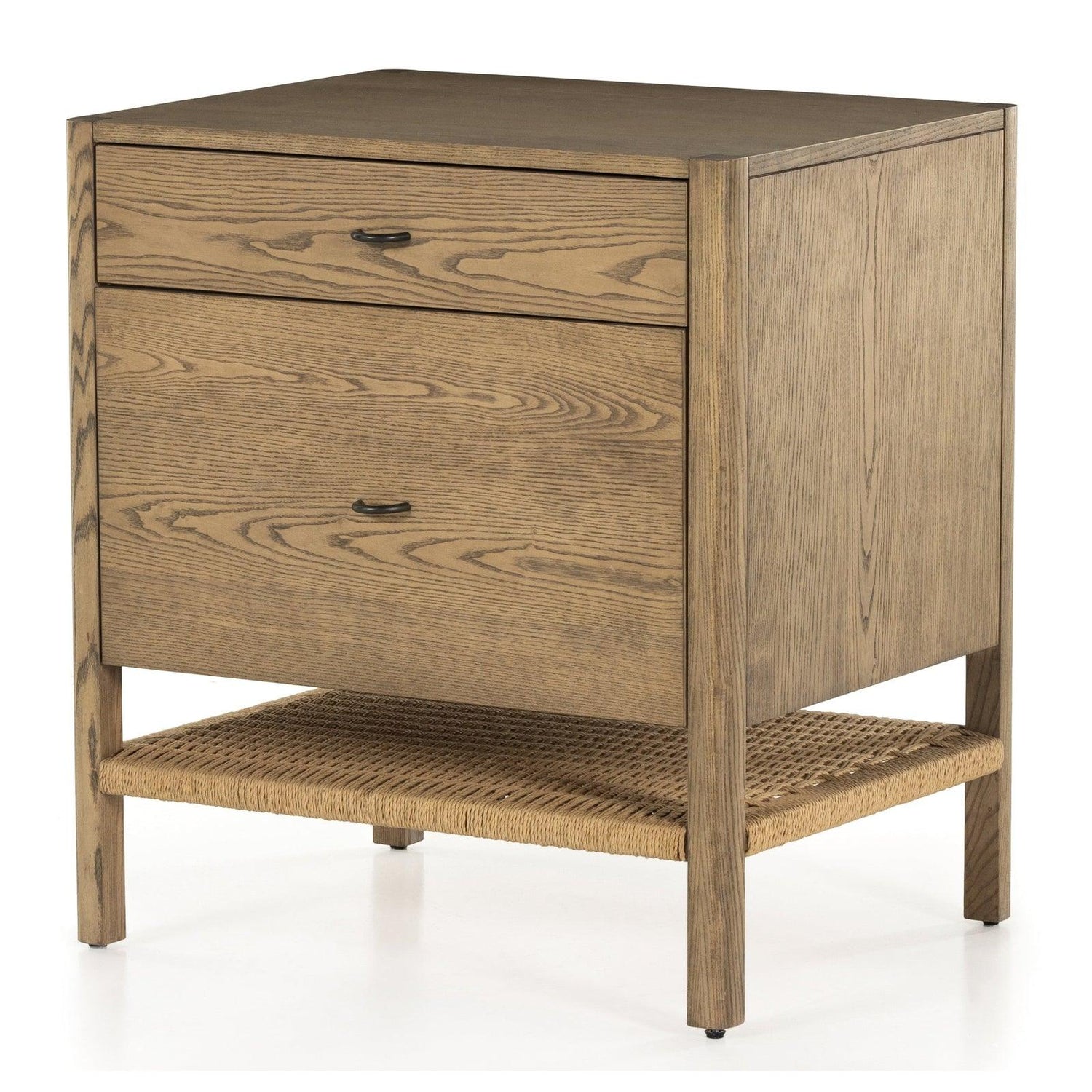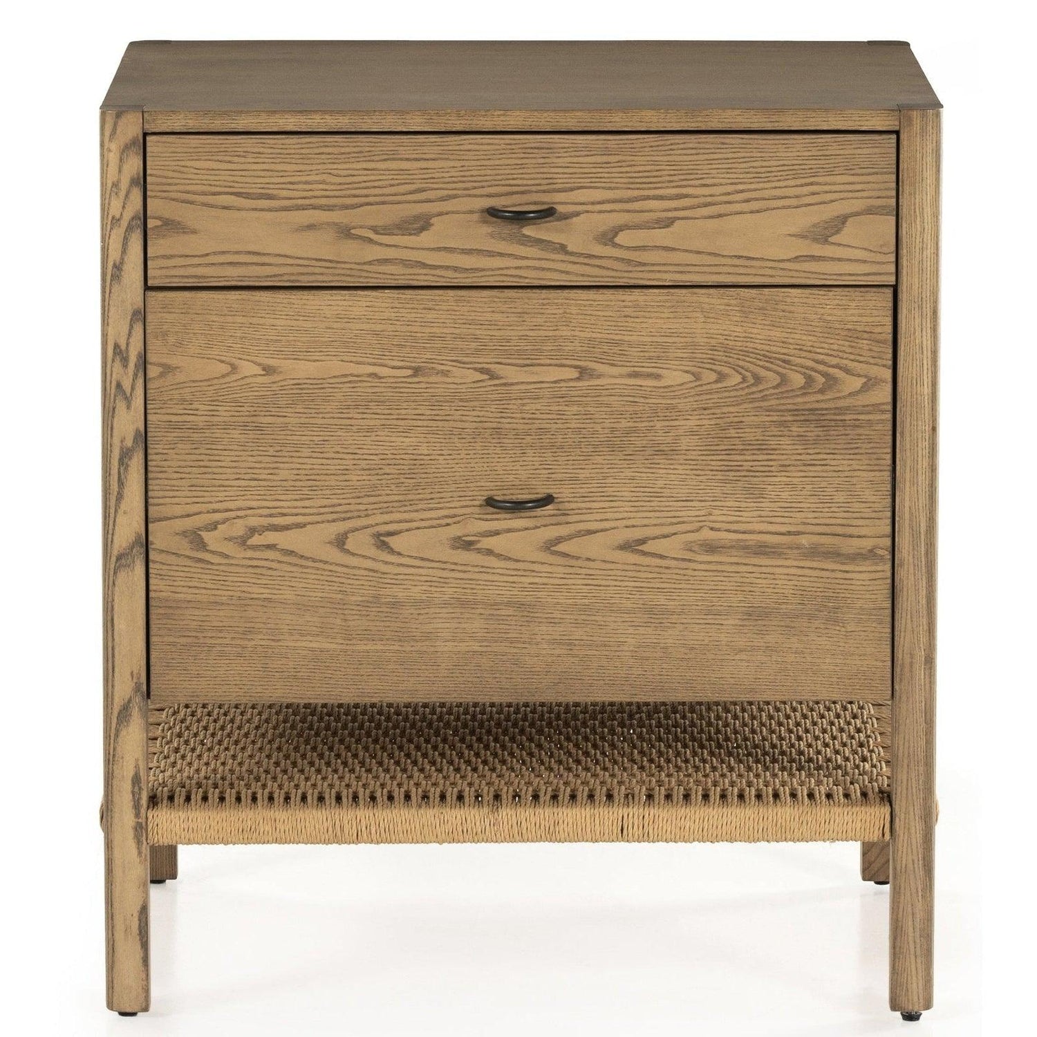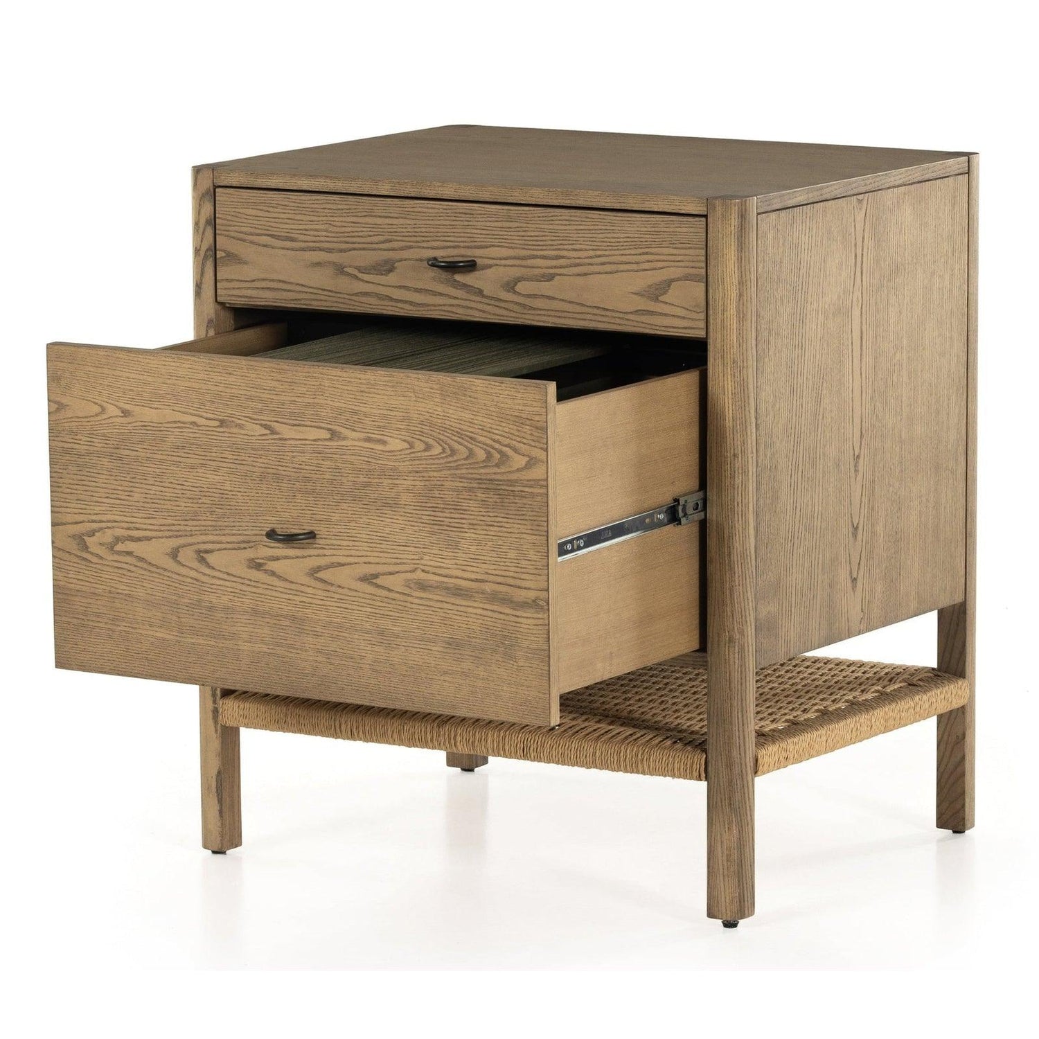 • Los gabinetes de fresno con acabado natural cuentan con dos cajones espaciosos para guardar archivos y un estante tejido para darle un toque texturizado único.