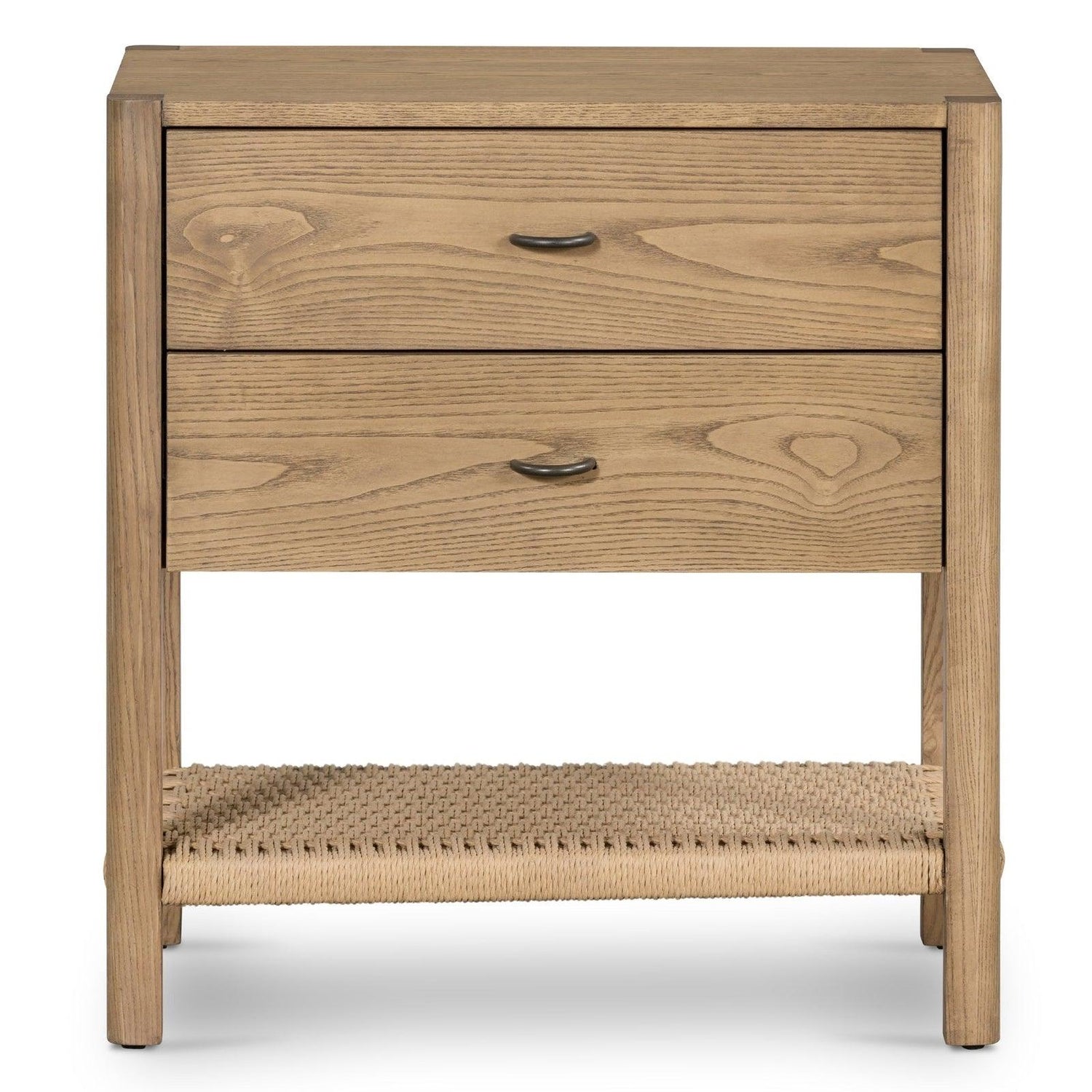 - Simple pero refinada, esta mesita de noche con influencia de diseño danés está hecha de fresno macizo, con herrajes de hierro acabados en un elegante tono metalizado.
