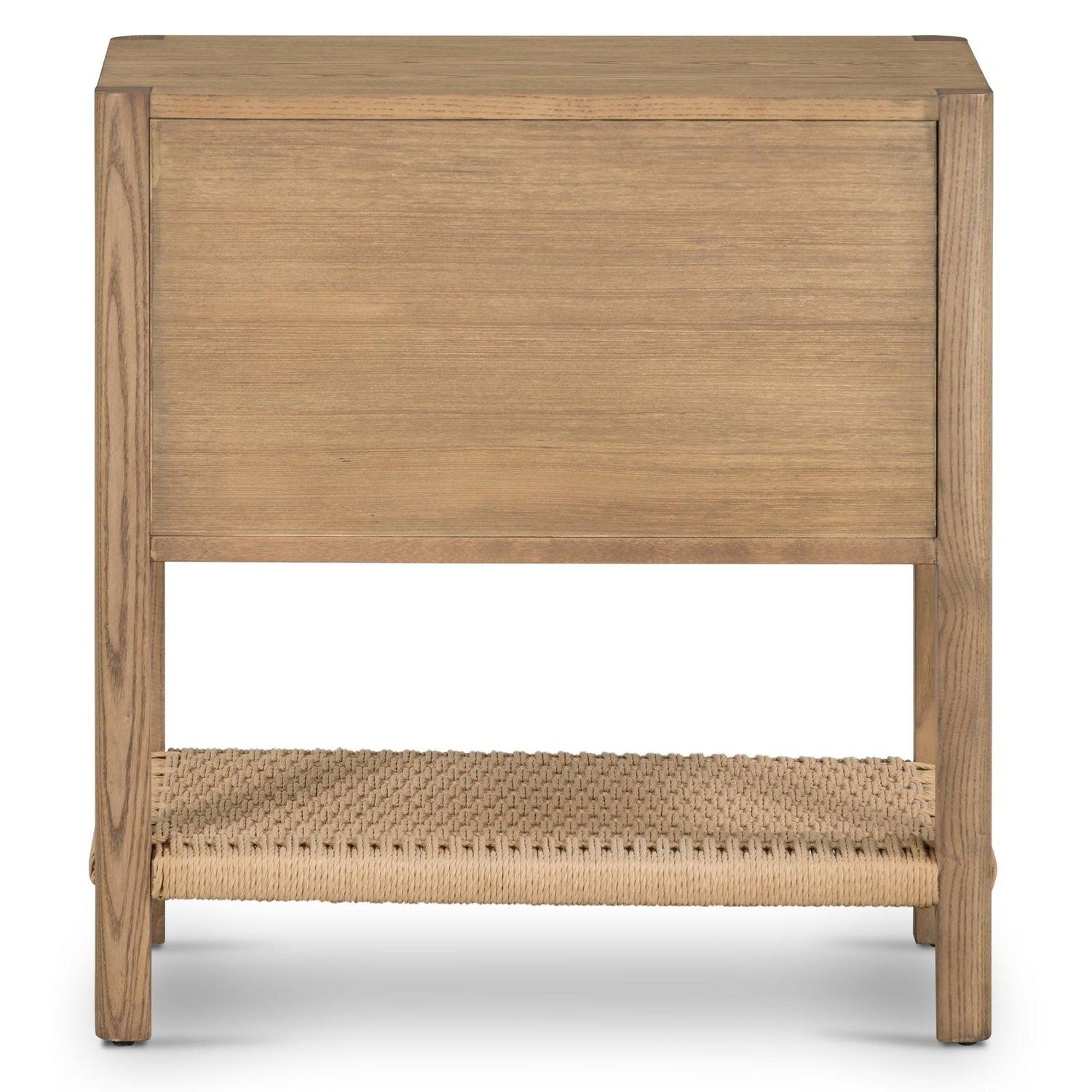 - Los cajones dobles brindan un generoso espacio de almacenamiento junto a la cama, mientras que las estanterías estilo camilla hechas de cordón de papel tejido brindan un toque final texturizado.