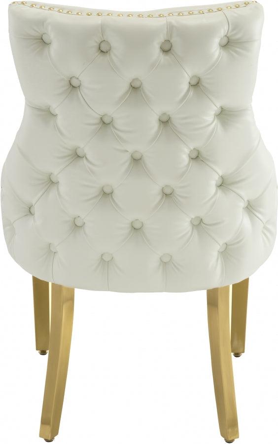 La silla de comedor Tuft de piel sintética es una auténtica maravilla desde cualquier ángulo, convirtiéndola en una opción ideal para los comensales. Su elegante tapizado de piel sintética blanca le confiere una sensación de lujo, mientras que los detalles de tachuelas y capitoné con botones la convierten en un elemento estético en su espacio. Sus patas de acero inoxidable dorado ofrecen el soporte necesario para una larga durabilidad.