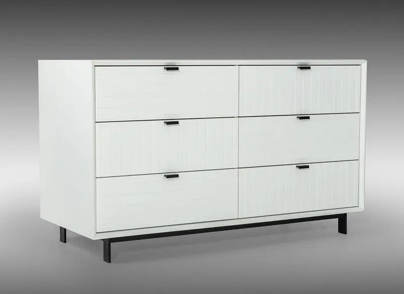 La cómoda contemporánea Nova Domus Valencia blanca satisface tus necesidades de almacenamiento ordenado. Con 6 cajones, ofrece amplio espacio de almacenamiento. Los frentes de los cajones se acentúan con rebordes horizontales y verticales opuestos y tiradores negros. Sus resistentes patas de metal negro mantienen la cómoda en su sitio.