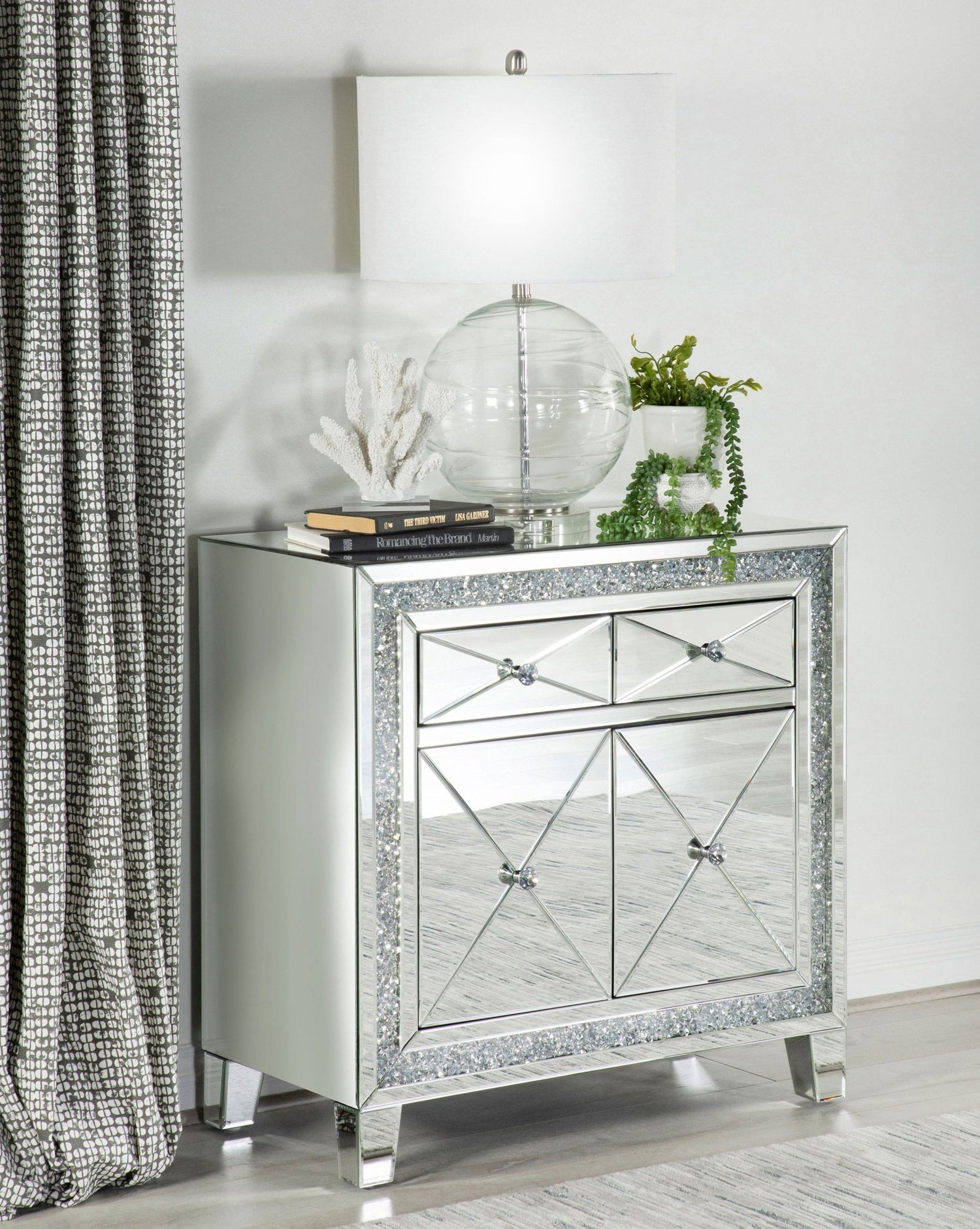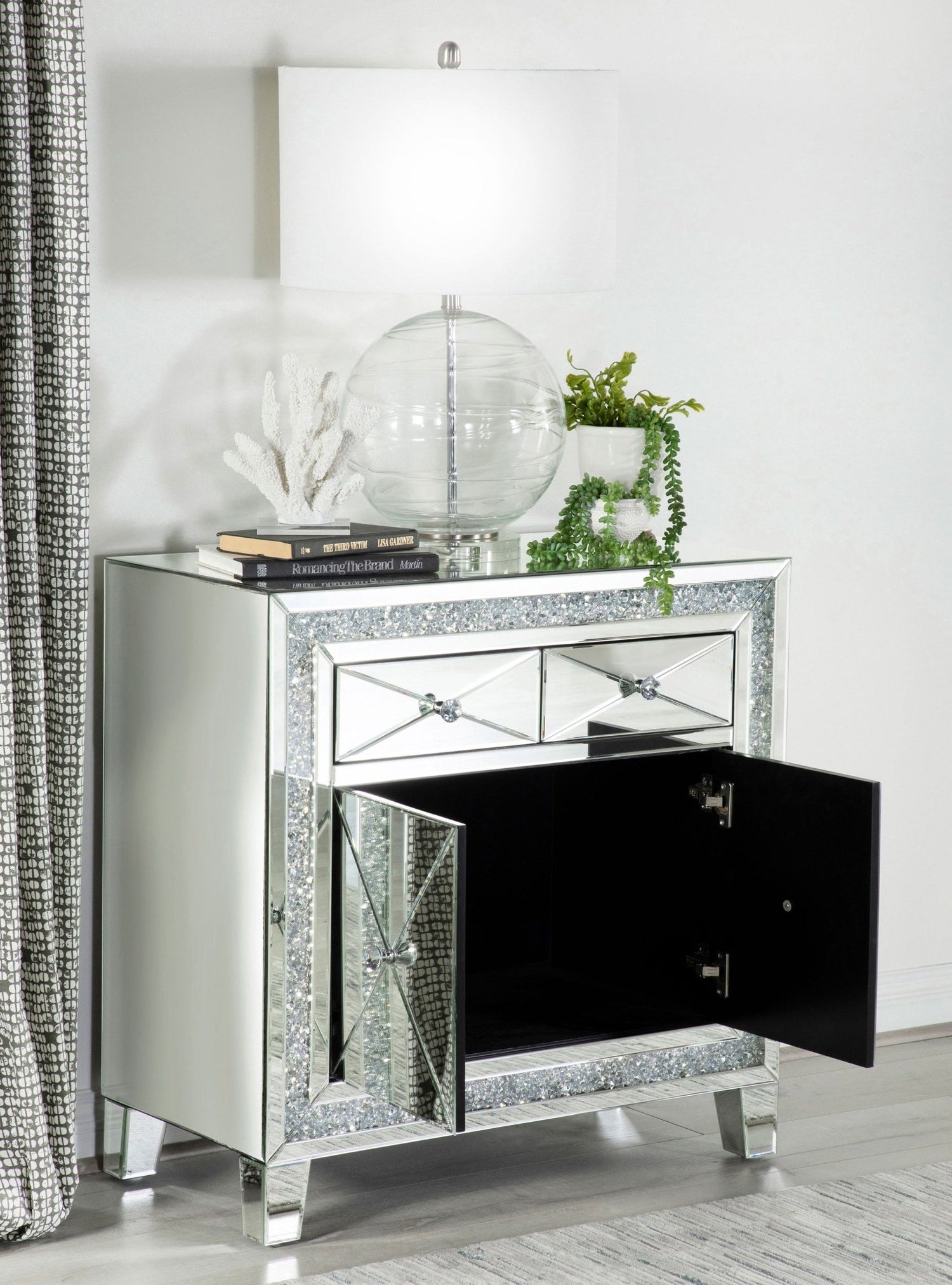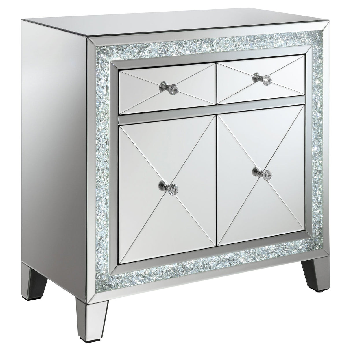 Home Elegance Furniture presenta con orgullo el gabinete decorativo de 2 cajones con espejo transparente e iluminación LED Arwen | Coaster , una adición refinada diseñada para realzar su hogar con un estilo atemporal.