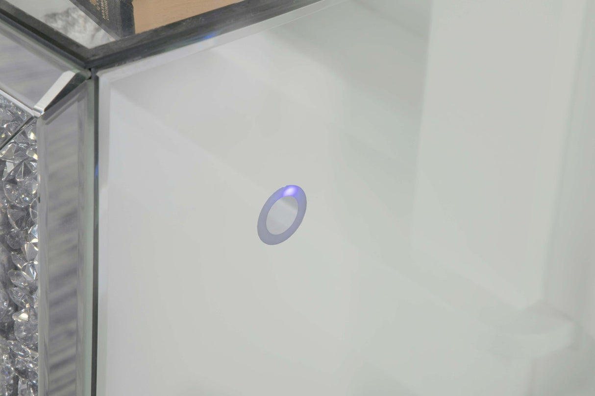 Acentos brillantes y elementos refinados se unen en este glamuroso mueble auxiliar. Cubierto completamente con superficies de espejo transparente y molduras y azulejos biselados, este mueble contemporáneo se convierte en un elemento atractivo en cualquier espacio. Dos cajones superiores y un armario inferior, cada uno adornado con brillantes pomos de cristal, permiten guardar objetos ordenados y ocultos. Un marco con incrustaciones de cristal triturado rodea el armario frontal y los cajones, creando un efecto impactante y audaz al retroiluminarse con la pantalla táctil LED blanca. Cada cajón cuenta con guías de extensión completa para un manejo suave.