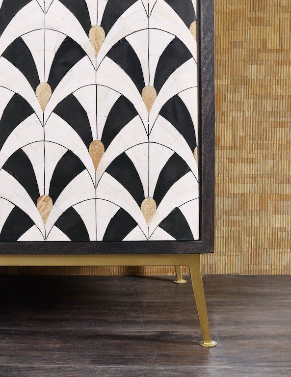 - Incrustaciones de hueso y madera: los impresionantes detalles con incrustaciones en los frentes de las puertas crean un elemento de diseño único y agregan interés visual.