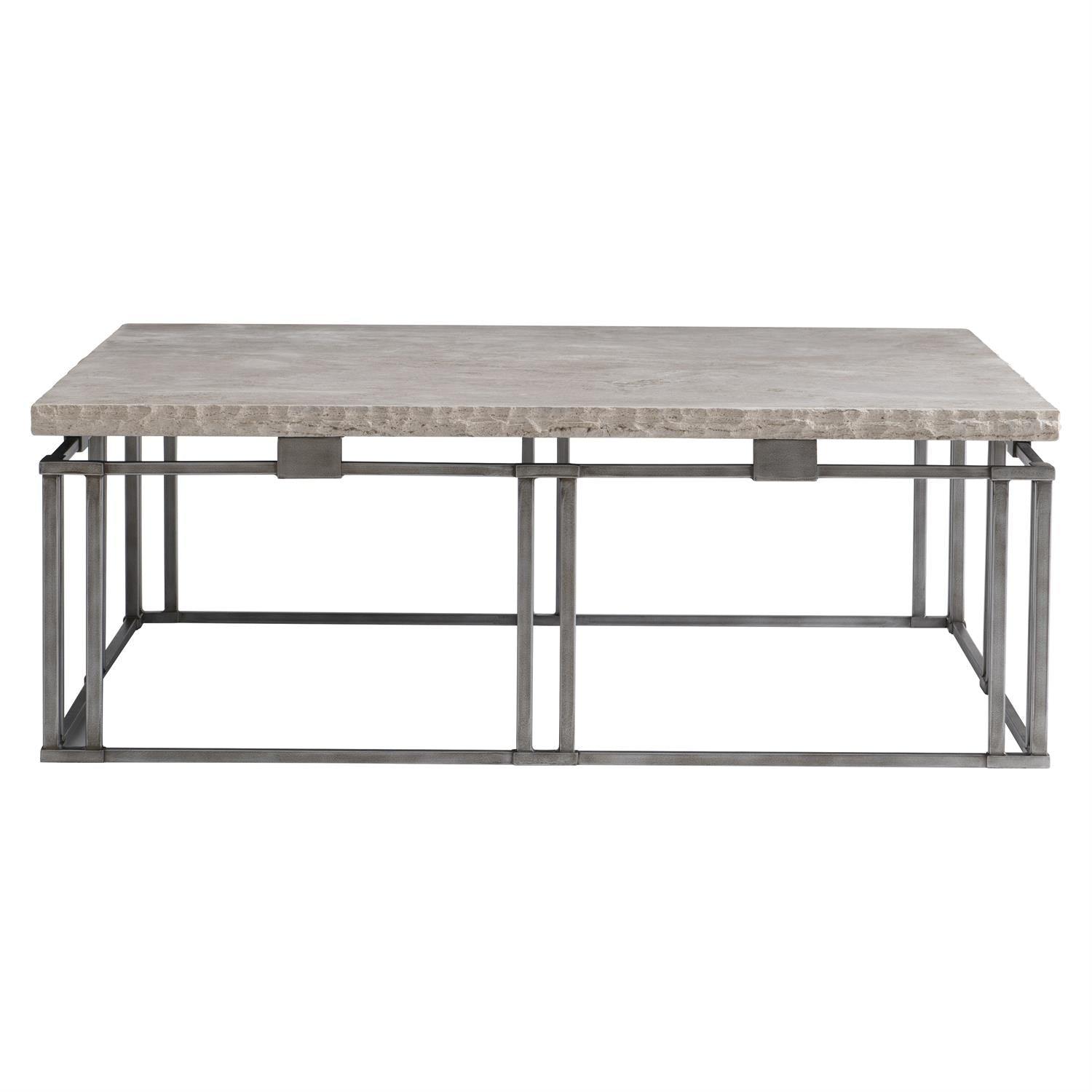 La mesa de cóctel Riverton de 122 cm de Bernhardt Living exhibe un refinado estilo arquitectónico con raíces en el movimiento Arts and Crafts. Un tablero cuadrado de piedra laminada en travertino Bianco pulido reposa sobre una base de metal plateado entrelazado, creando la ilusión de una forma flotante. Los bordes cincelados añaden detalles artesanales, mientras que las líneas limpias celebran el equilibrio y la simetría. Diseñada para un atractivo atemporal en espacios modernos.