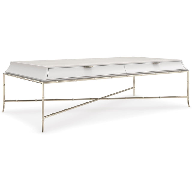 - Elevado sobre un marco y una camilla de metal de imitación de bambú, un cajón estilo pagoda pintado en color leche de almendras presenta una tapa de piel de tiburón sintética.