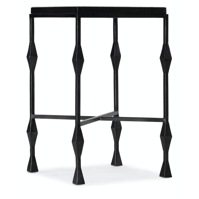 - De inspiración mundial, la mesa auxiliar Commerce & Market combina una cubierta de piedra travertino blanca con un patrón de diamantes serigrafiado con una base de metal negro ligeramente escalonada con patas moldeadas.