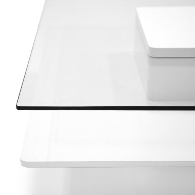La mesa de centro Clarion es la pieza moderna perfecta. Esta mesa de varios niveles presenta materiales contrastantes que crean interés visual y textura. El vidrio templado transparente compone la capa superior de esta hermosa mesa de centro, mientras que un blanco brillante rodea la capa inferior.