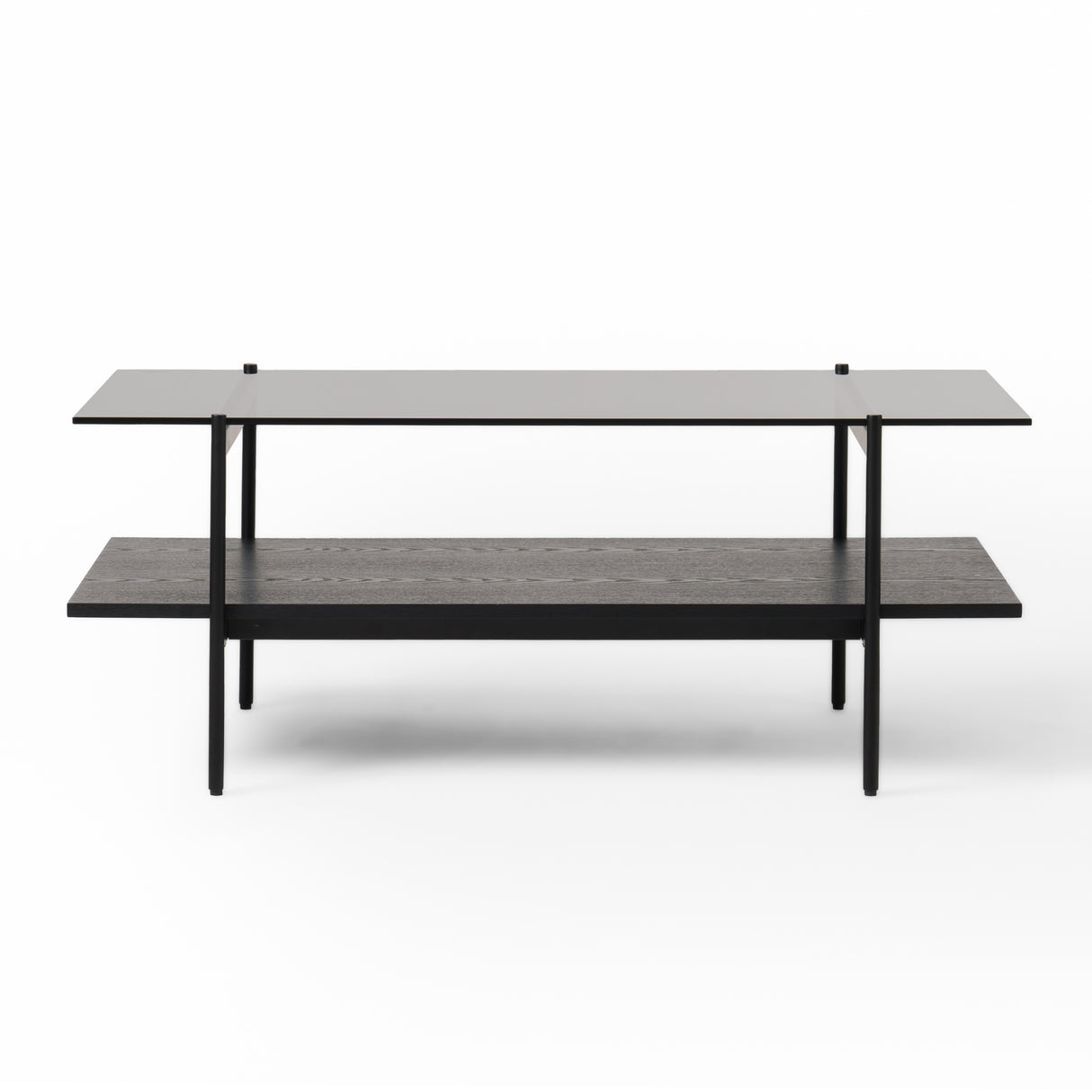 La mesa de centro rectangular Conley está hecha de vidrio templado gris y chapa de fresno negro. Su diseño apilable permite almacenamiento debajo y es una pieza central ideal para tus amigos o familiares en tu sala de estar.