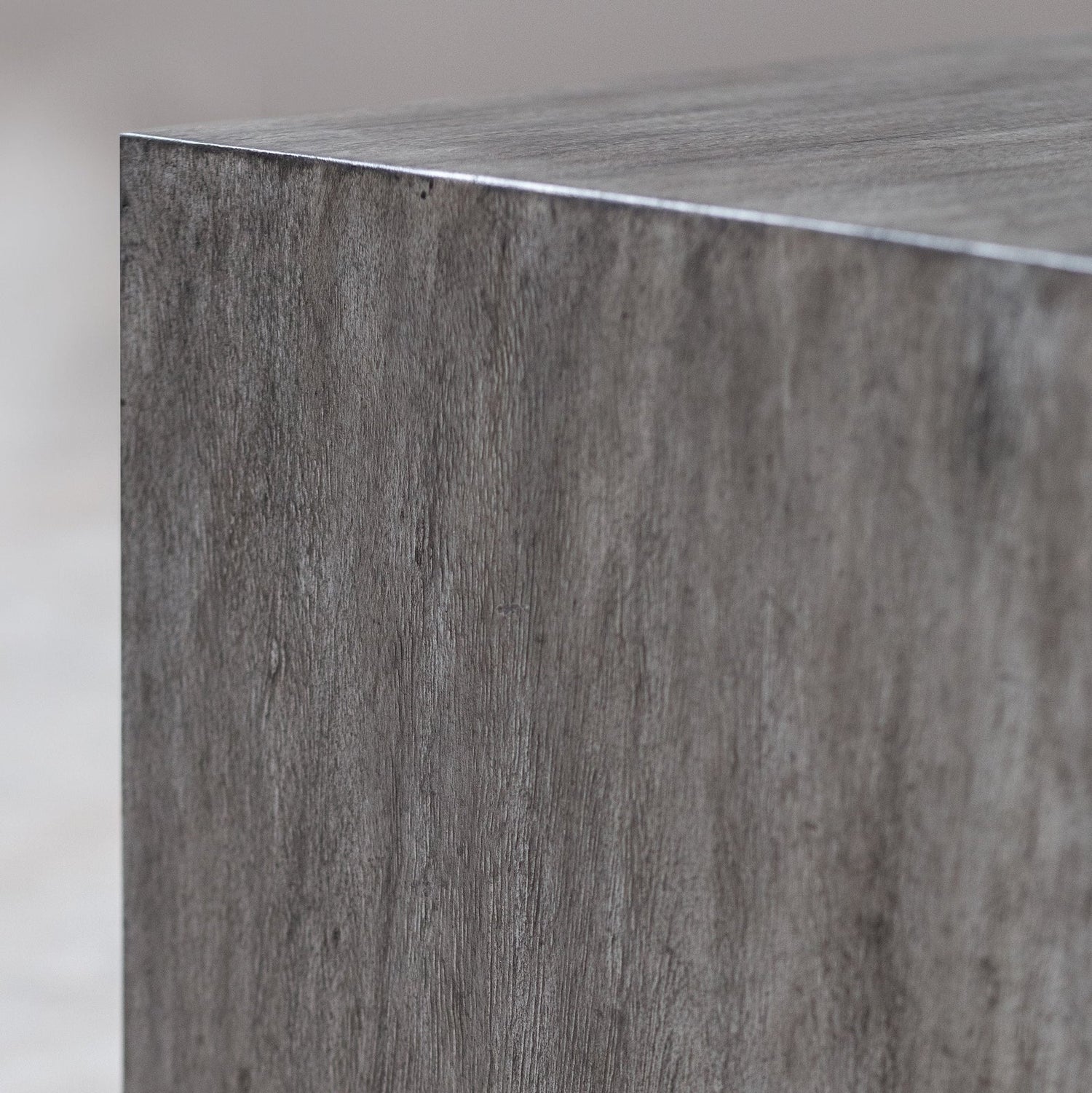 - Con un perfil bajo, esta moderna mesa de centro está revestida con una capa de chapa con acabado gris metálico cálido y una base de pedestal flotante.