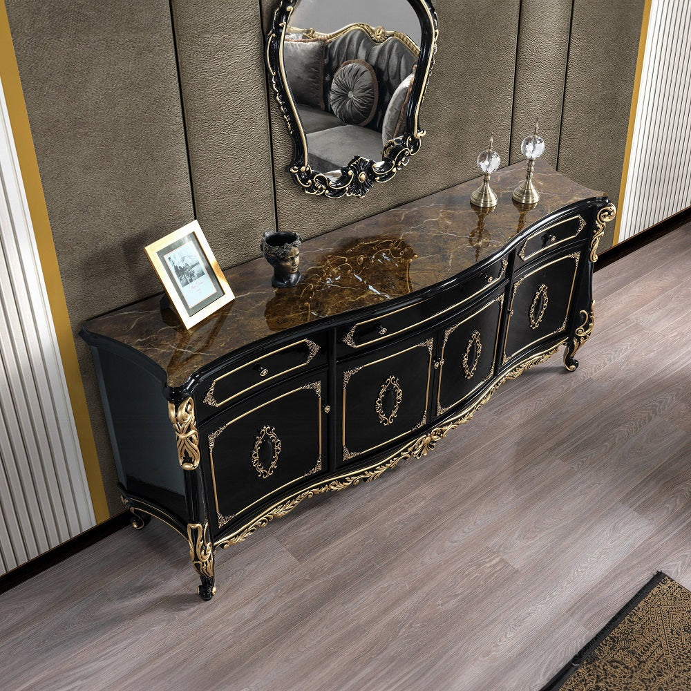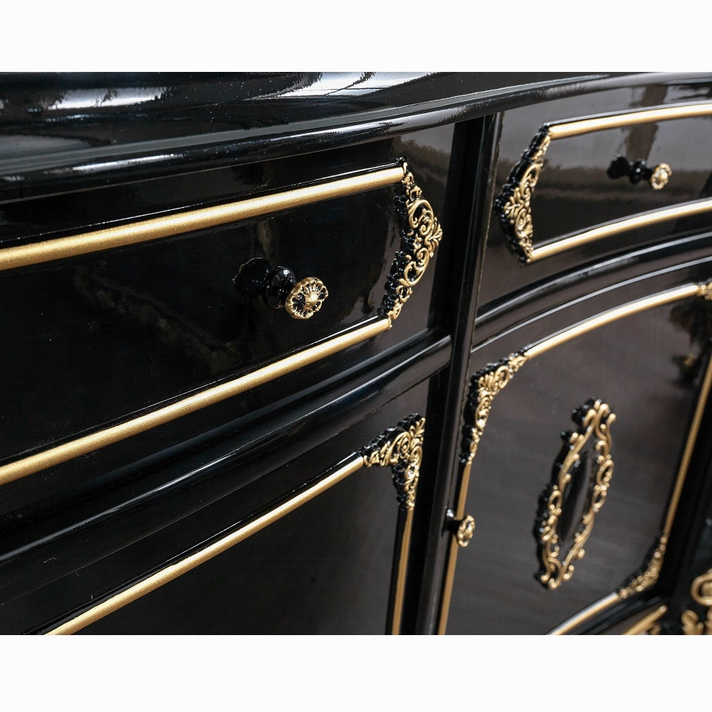 En una moderna combinación de colores negro piano y dorado, la consola Betria es contemporánea y atemporal. La pintura dorada acentúa los detalles tallados sobre la base negra. Ofrece amplio espacio de almacenamiento para mantener un espacio ordenado. Perfecta para un comedor o sala de estar, las posibilidades son infinitas. Completa el look con el espejo ornamental a juego, con el mismo acabado brillante en negro piano y detalles dorados.