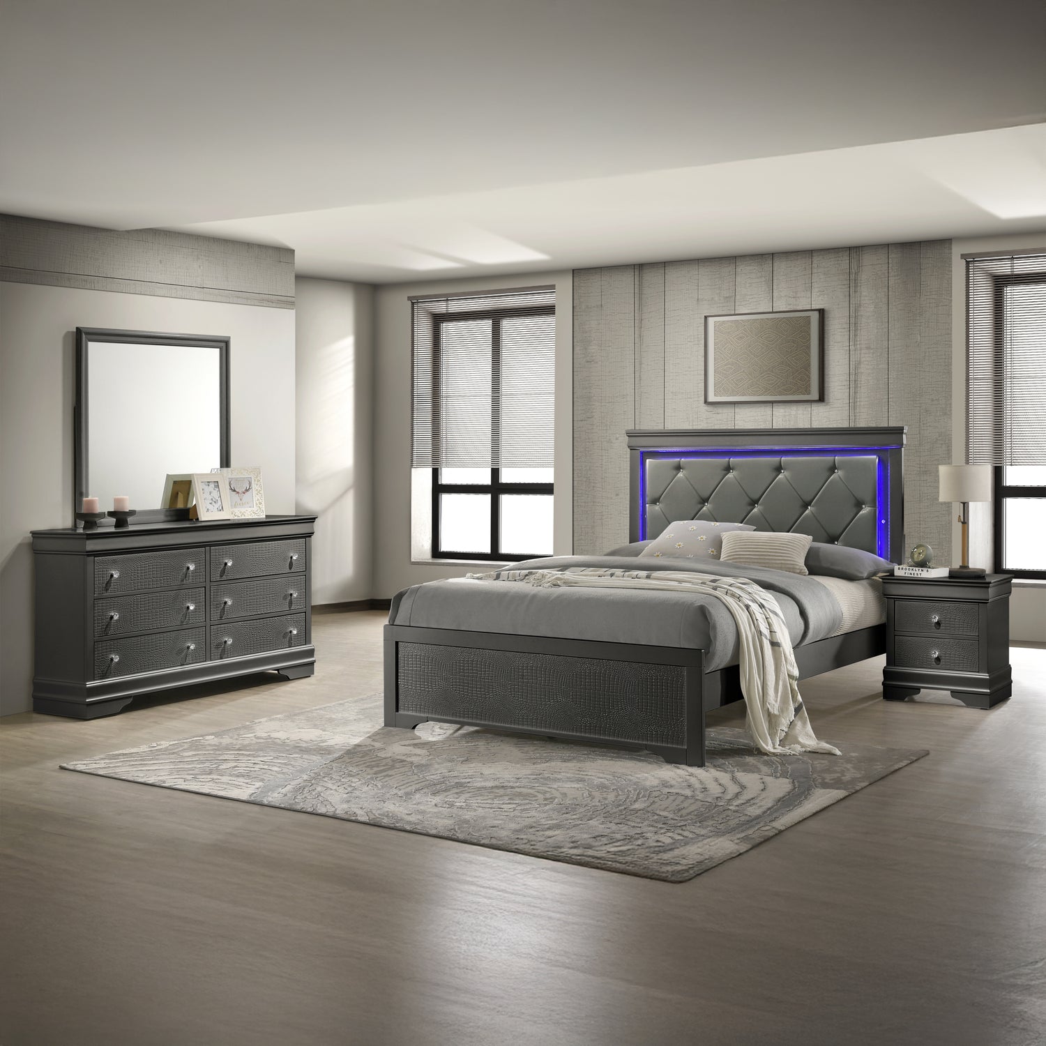 - Luxurious Touches: The bed boasts an upholstered tufted headboard with LED lighting, while the top drawers of the dresser, nightstand, and chest are lined with red velvet.