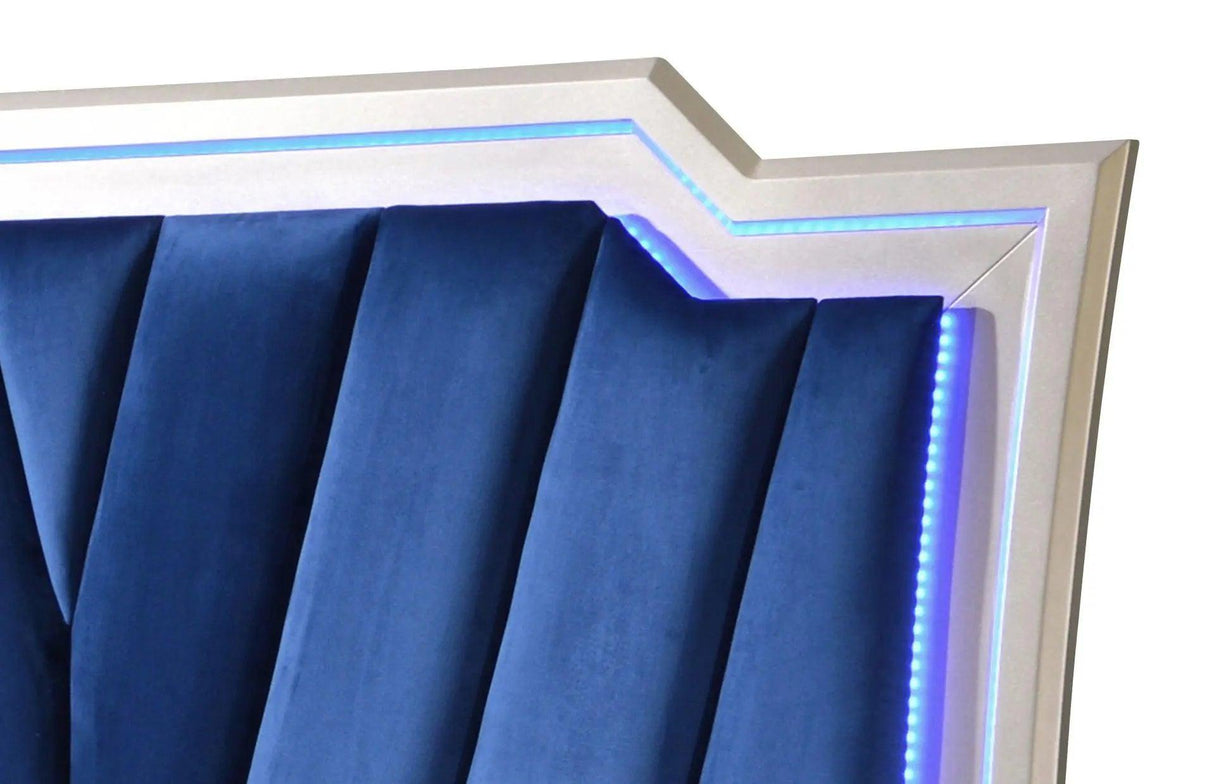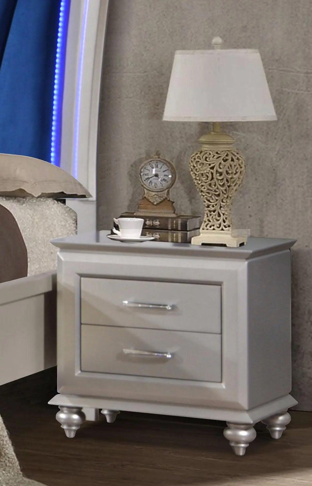 Juego de dormitorio moderno Alia de 6 piezas con acabado plateado | Cosmos - Tamaño Queen / Cama + Cómoda + Espejo + Cómoda + 2 Mesillas de Noche está agotado y se enviará tan pronto como vuelva a estar disponible.