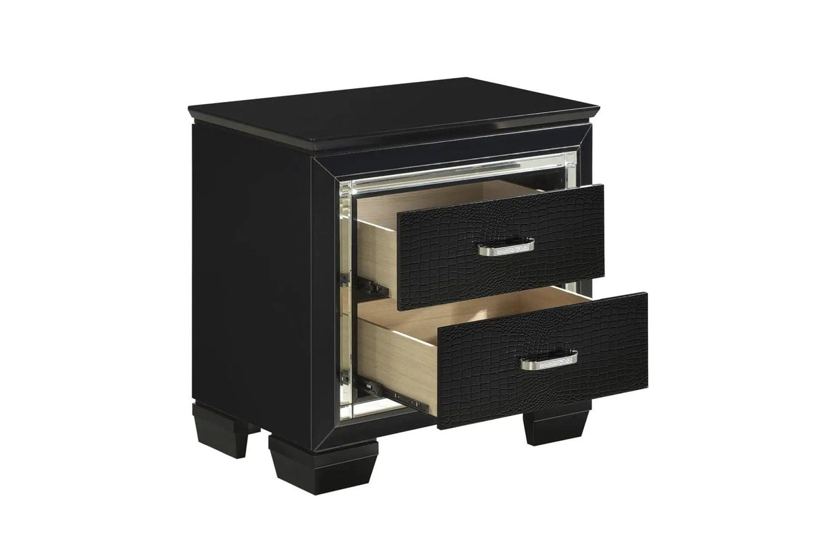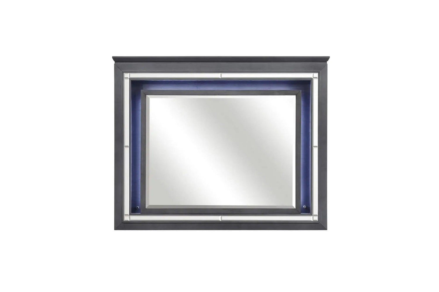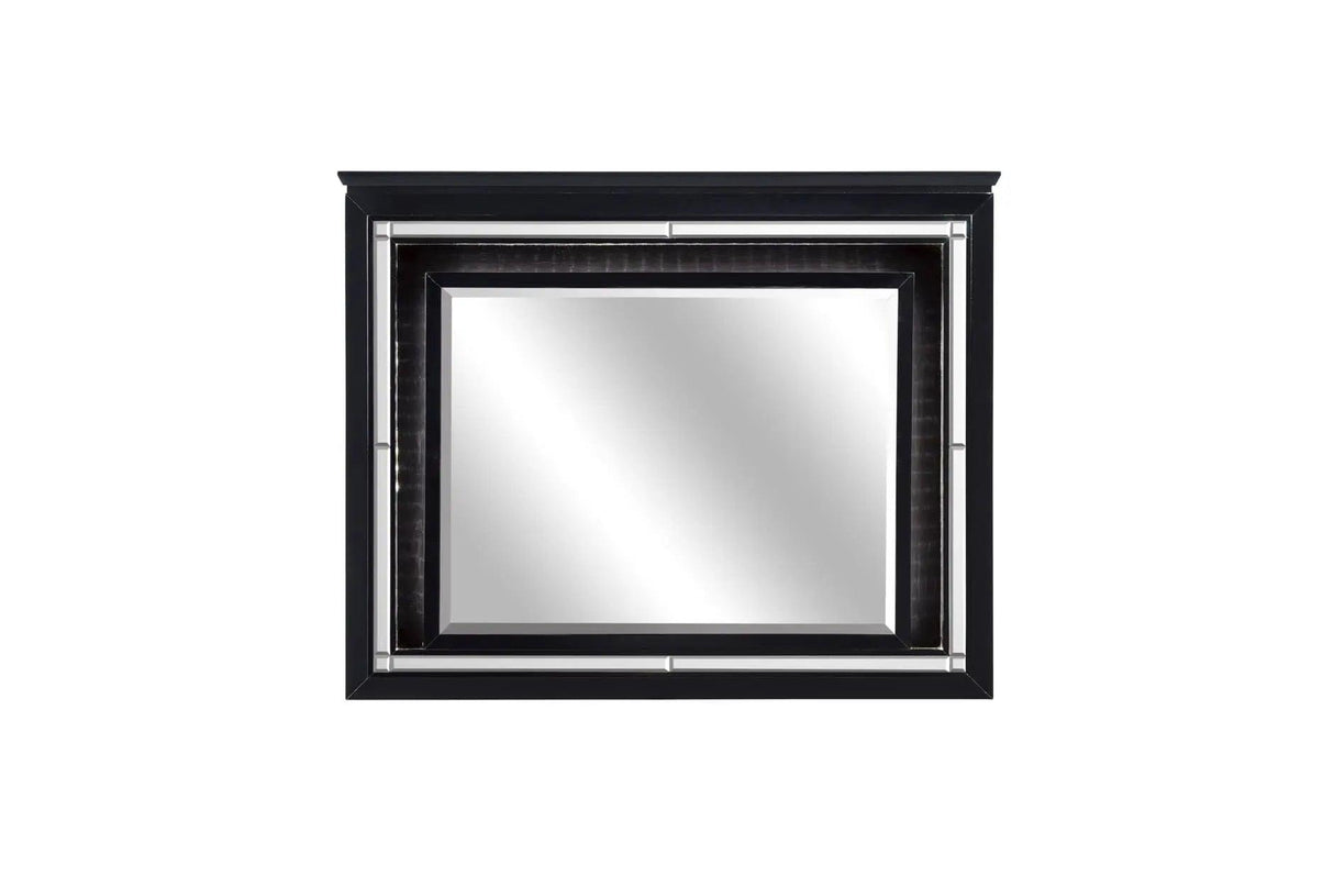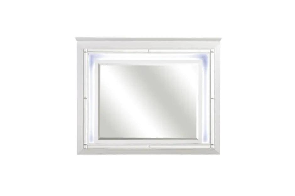 El glamour reina en el diseño de la Colección Allura. Un espejo biselado decorativo enmarca cada pieza y realza la iluminación de la retroiluminación LED táctil del cabecero y el espejo, así como la luz inferior de la mesita de noche. El relieve de cocodrilo y los herrajes de cristal pulido realzan con audacia el acabado disponible en plata, negro, gris o blanco de la colección. La cama requiere una base/somier para el colchón. El colchón y la decoración no están incluidos.