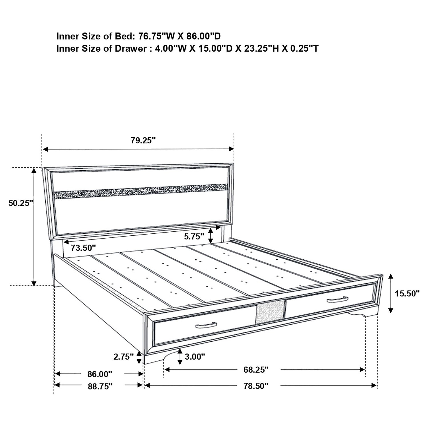 Cama California King con espacio de almacenamiento: 79,25" de ancho x 88,75" de profundidad x 50,25" de alto