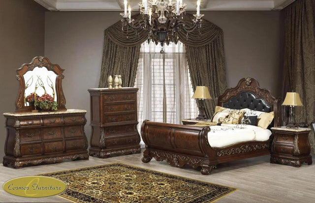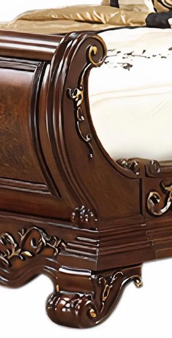 La cama estilo trineo Cleopatra de Cosmos Furniture, de estilo tradicional y con acabado en cerezo, crea un ambiente elegante y tradicional en su dormitorio. Esta pieza, bellamente elaborada e inspirada en los lujosos diseños del pasado, presenta elaborados detalles de madera tallada en la cabecera, el pie de cama y las barandillas. El pie de cama invertido es la pieza central de este clásico juego de dormitorio. Esta cama encarna un estilo y una apariencia atemporales que harán que cualquier dormitorio principal se sienta refinado y cómodo. Las mesitas de noche y otros muebles a juego completan el estilo de su elegante estilo.
