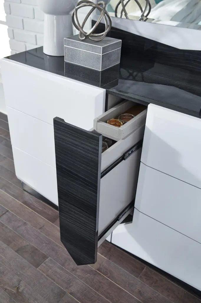 Dale a tu dormitorio un toque contemporáneo con el juego de dormitorio Hudson Modern Queen de Global Furniture, con acabado en blanco brillante. El juego de dormitorio Hudson ofrece una elegancia chic y vanguardista que todos aprecian. Un estilo impactante no tiene por qué abrumar tu espacio. Hudson ofrece un encanto deslumbrante. Su acabado en blanco brillante con detalles en zebrano negro y gris realza las líneas limpias y la belleza de alto contraste. Para una apariencia limpia pero impactante en tu dormitorio, llena de tonos neutros y complementarios, que evocan el diseño moderno en su máxima expresión, la colección de dormitorio Hudson es la opción perfecta.