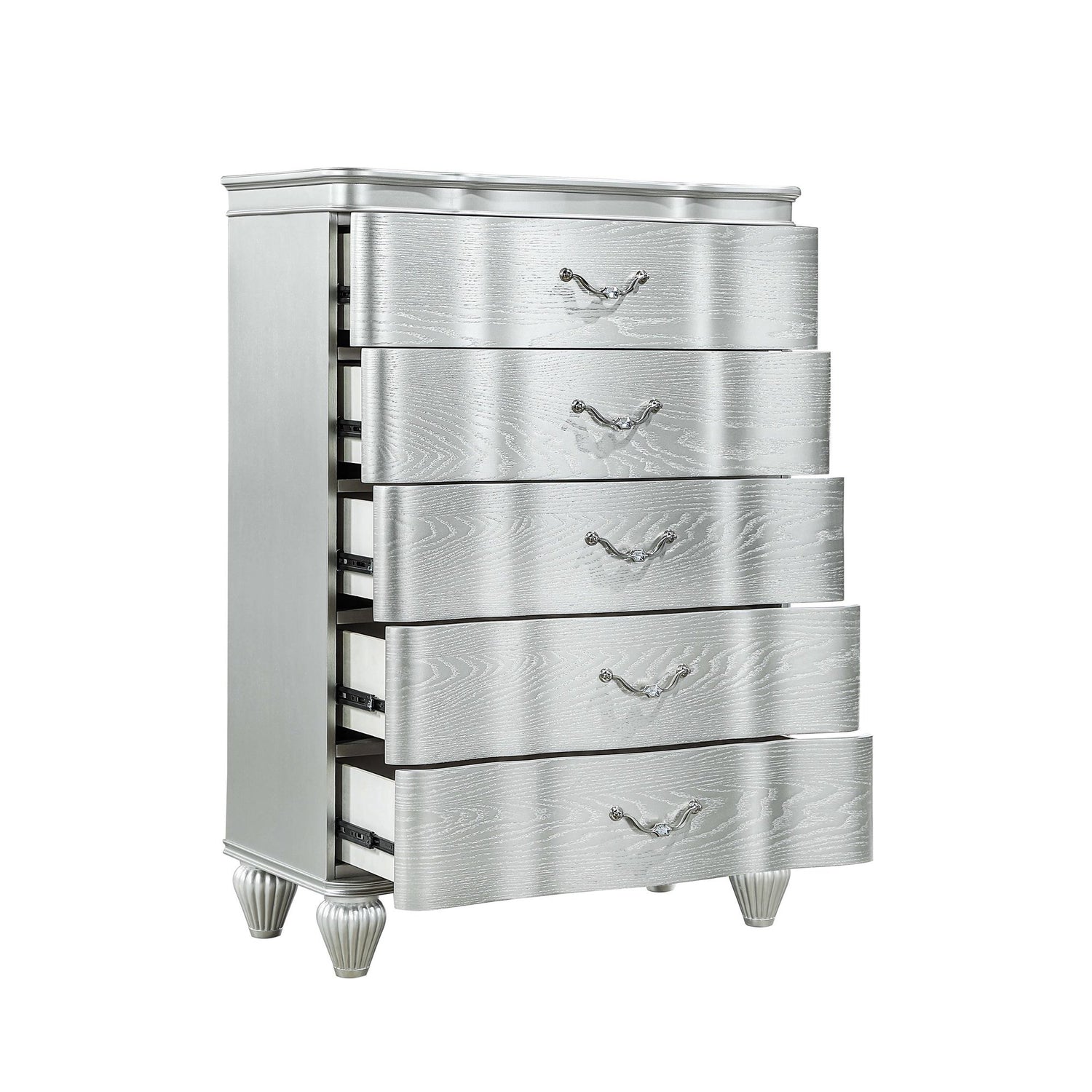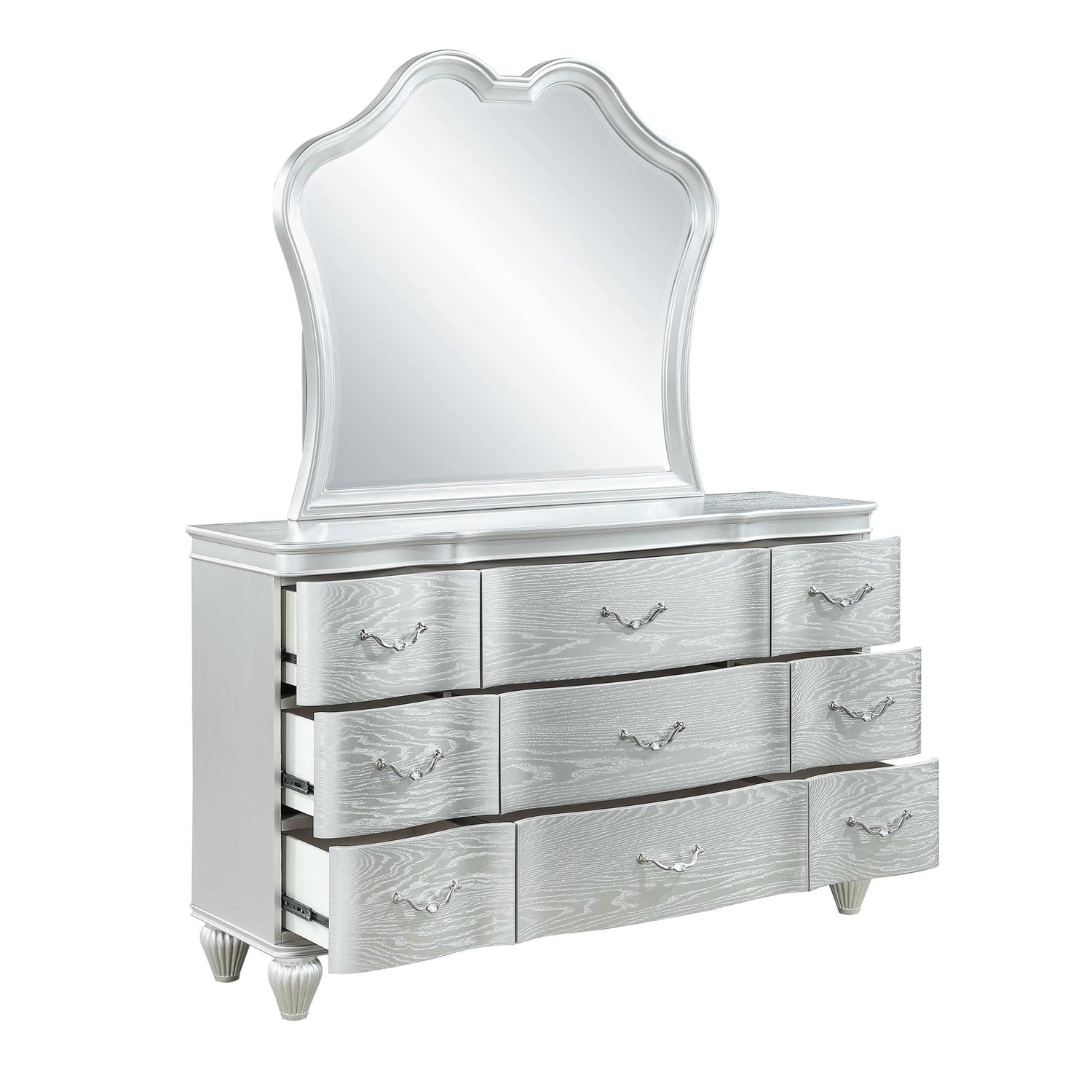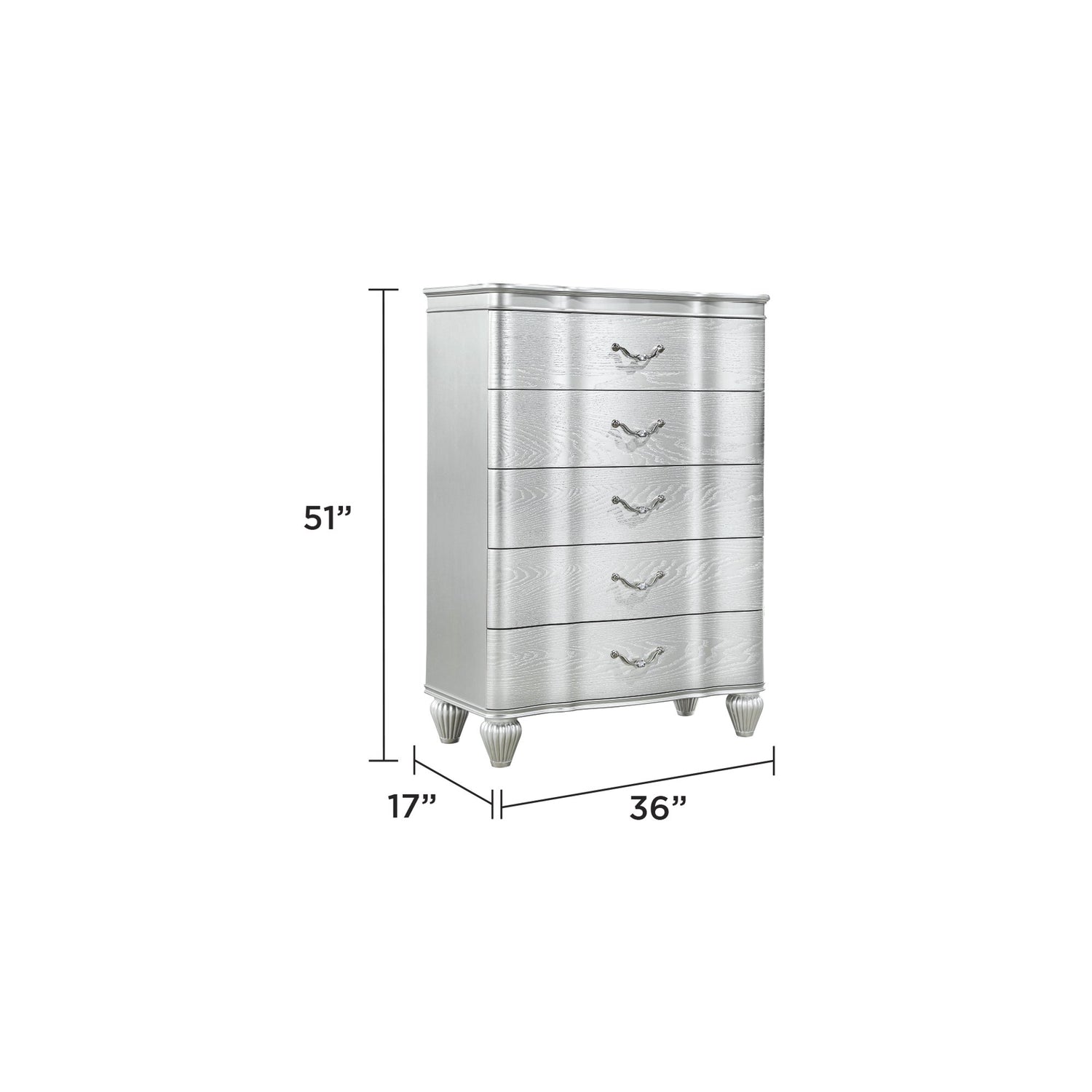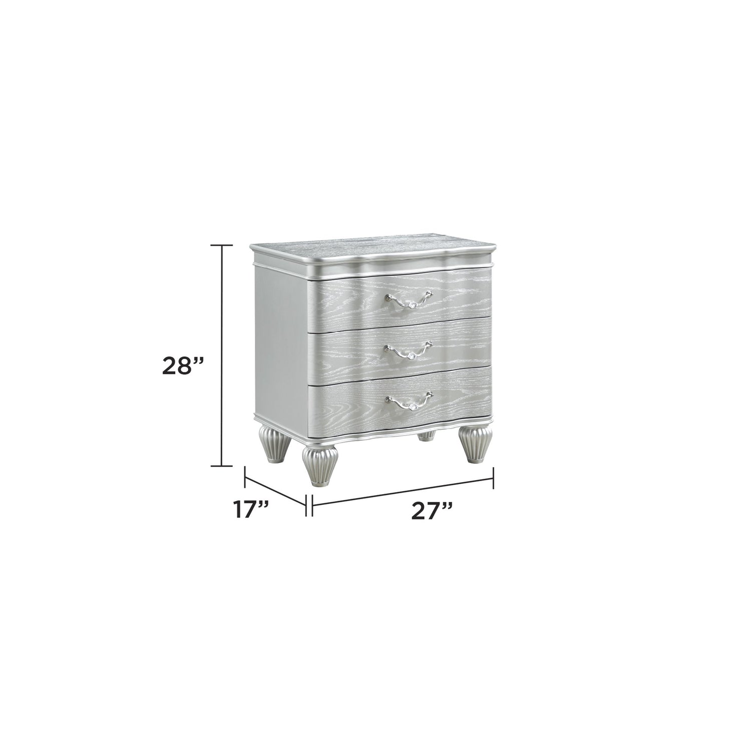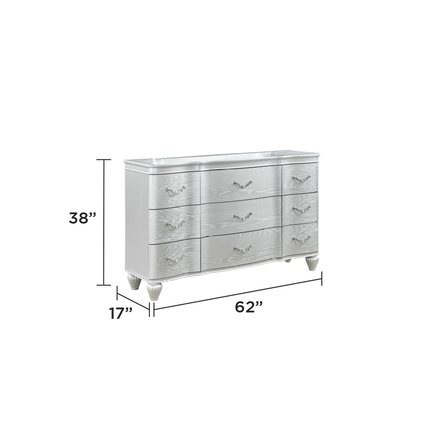 Cada pieza del conjunto está cuidadosamente diseñada para brindar comodidad y belleza. La cómoda incluye nueve amplios cajones, ideales para organizar ropa y accesorios. La mesita de noche de tres cajones ofrece almacenamiento adicional. La cómoda extragrande de cinco cajones añade aún más espacio para artículos voluminosos, como mantas o ropa de temporada. El interior forrado de fieltro de los cajones protege las prendas delicadas, mientras que el acabado plateado unifica el conjunto para lograr una estética transicional y elegante.