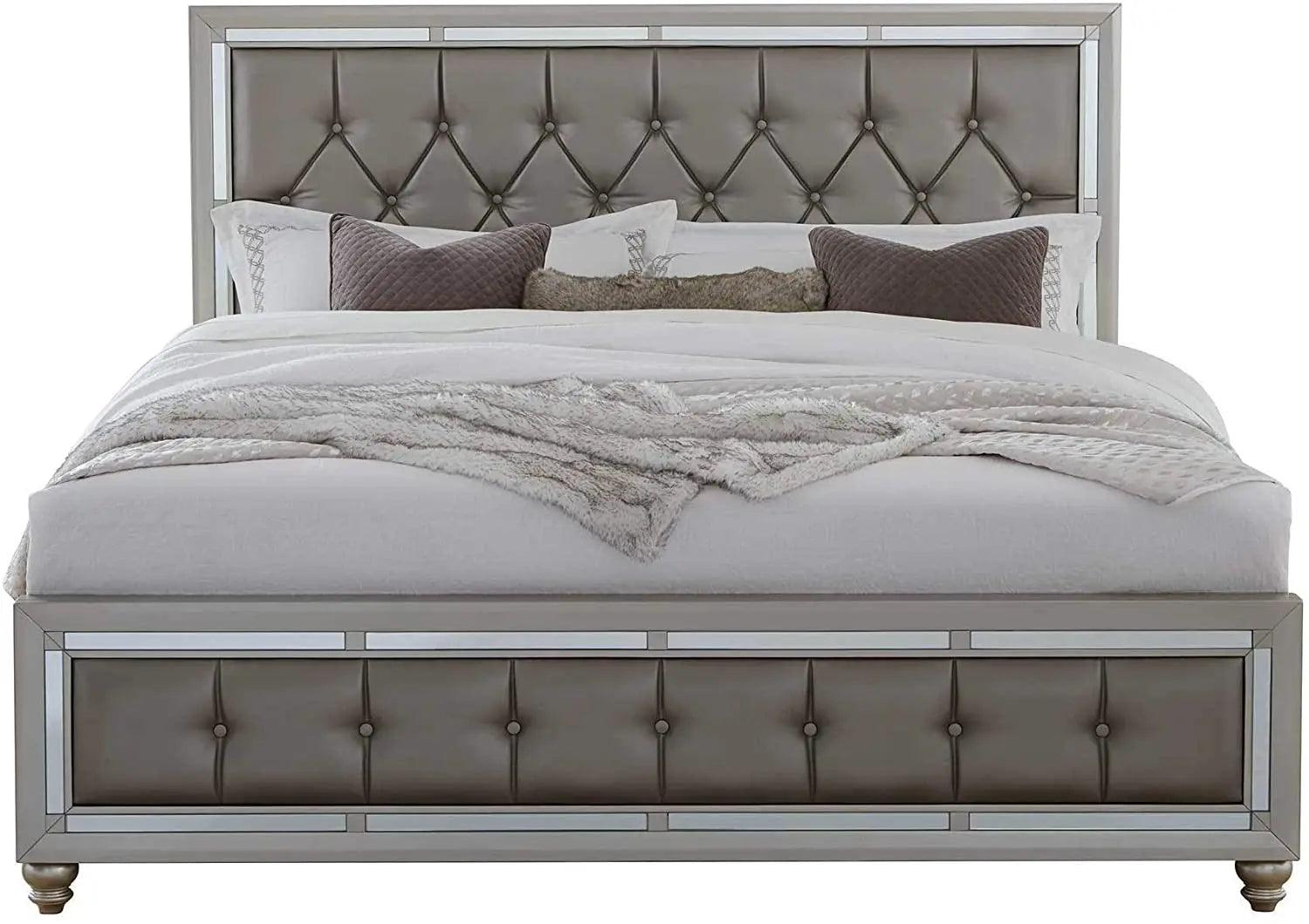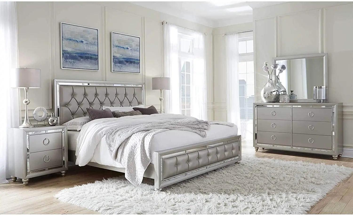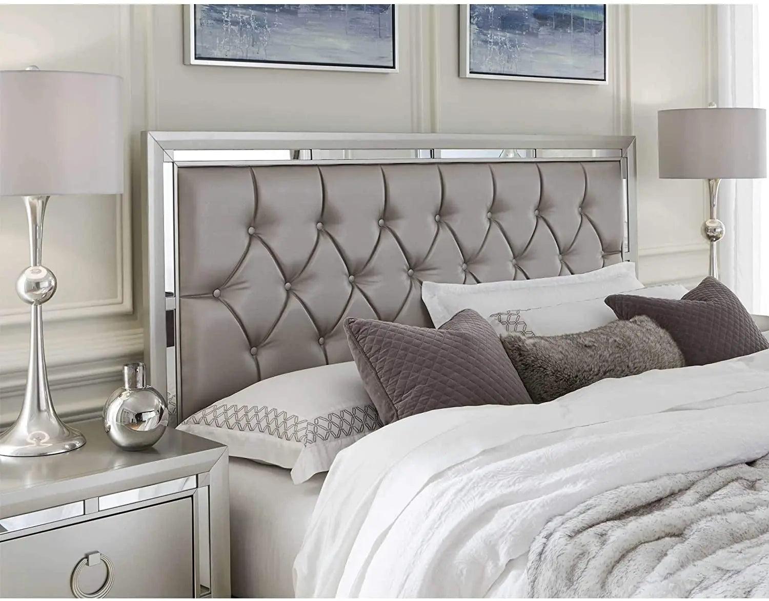 El Riley le da un toque contemporáneo al estilo clásico. Su lujoso acabado plateado y los detalles de espejo aportan un toque elegante y ultramoderno, mientras que la cabecera y el pie de cama capitoné evocan el estilo tradicional de los muebles artesanales de alta gama. Dale a tu dormitorio un toque contemporáneo con la Colección de Dormitorios RILEY. Fabricada en madera MDF y con un acabado color marfil, con polipiel perlada y detalles metálicos, esta colección sin duda revitalizará tu dormitorio principal. El dormitorio Riley de Global Furniture tiene un hermoso diseño moderno.