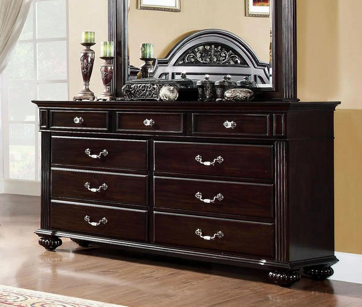 Juego de dormitorio tradicional Syracuse de Furniture of America - Nogal oscuro / Tamaño Queen / Cama + Cómoda + Espejo + 1 Mesilla de Noche está agotado y se enviará tan pronto como vuelva a estar disponible.