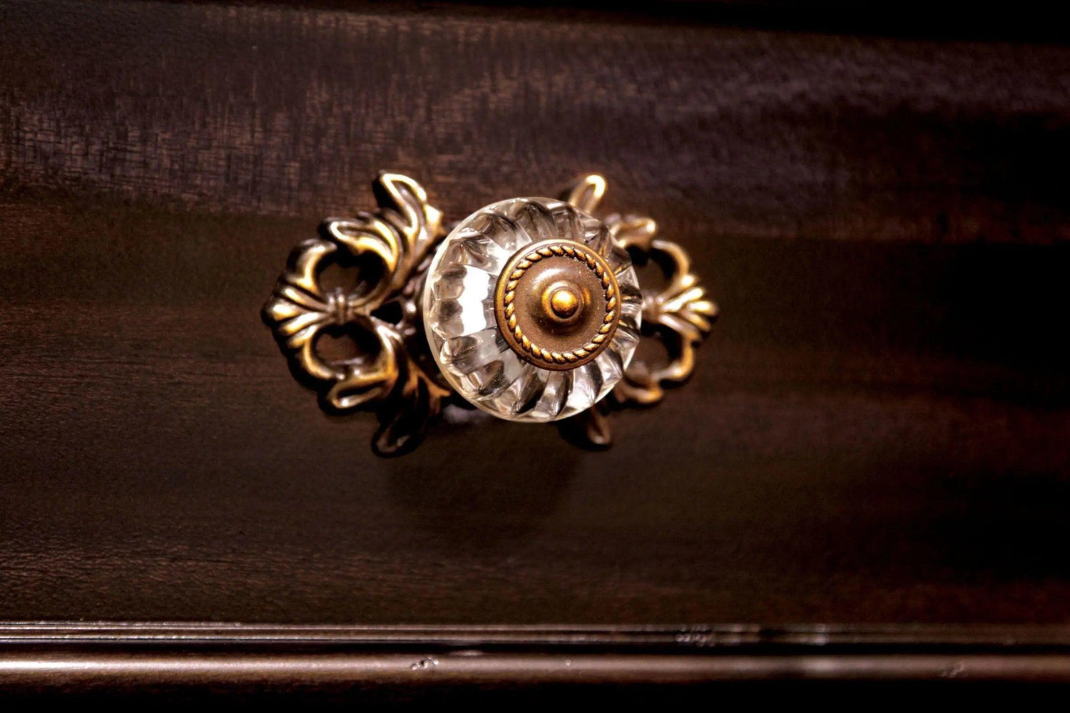 El cabecero y el pie de cama con paneles, junto con el espejo, incorporan hermosos detalles florales que combinan a la perfección con los elegantes tiradores de latón antiguo de los muebles a juego. La cama está disponible en dos colores: nogal oscuro y gris.