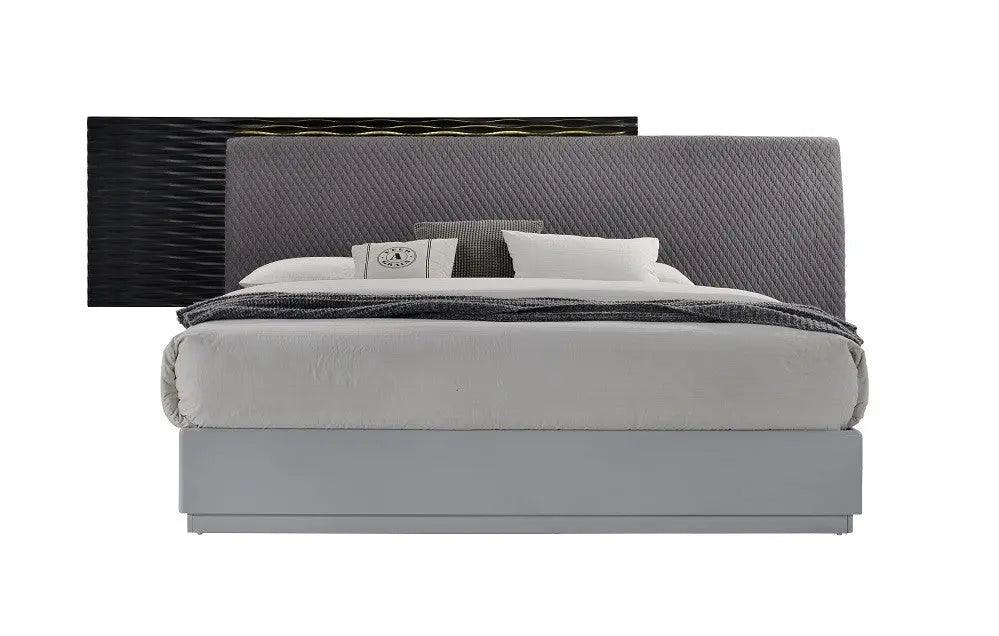 - Cabecero negro brillante con tapizado gris afelpado