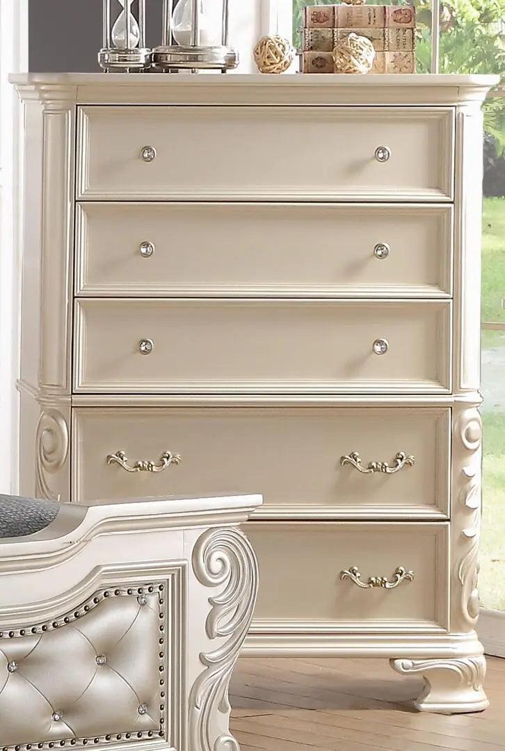 Añade elementos clásicos y tradicionales a tu dormitorio con esta pieza. Con hermosos detalles moldeados, una robusta construcción de madera y un magnífico acabado en color perla, esta pieza quedará fantástica en cualquier habitación o espacio. Los vívidos detalles tallados añaden un toque clásico que narra historias y le confieren un aspecto distinguido. Disfruta de una comodidad óptima y uniforme gracias al soporte de picos y valles que ofrece cualquier mueble capitoné. Su notable estética de diseño sin duda dará que hablar. Las mesitas de noche y otros juegos de dormitorio a juego completan el estilo de tu dormitorio.