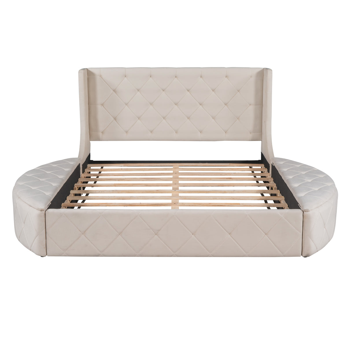 Cama Queen con plataforma tapizada y almacenamiento de terciopelo, con cabecera de alas, 1 cajón grande y 2 taburetes laterales con almacenamiento (beige): características y detalles clave