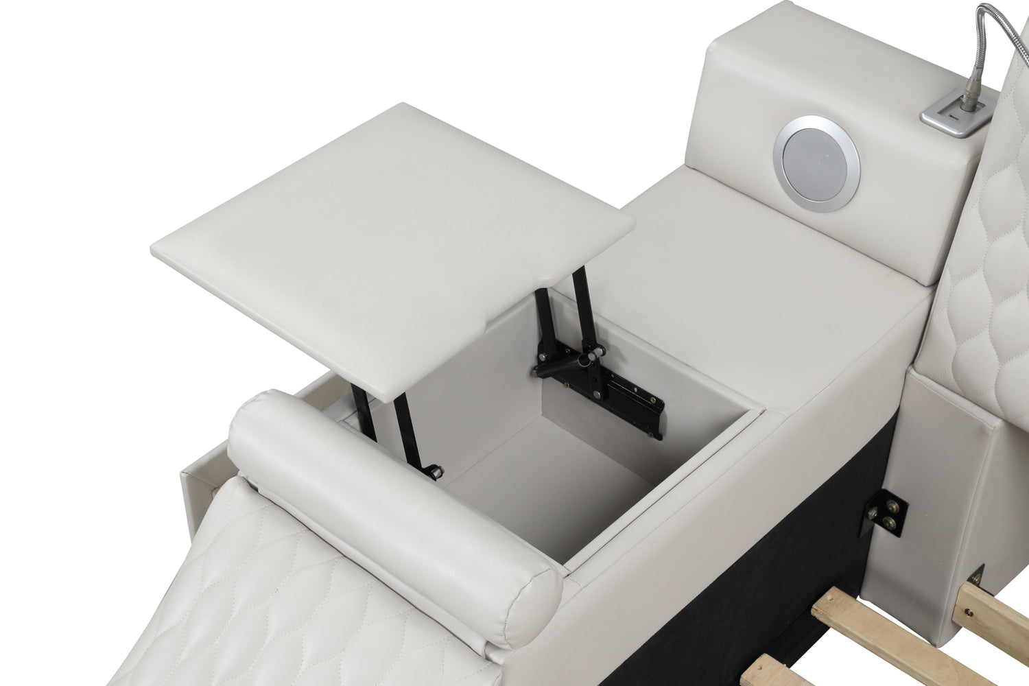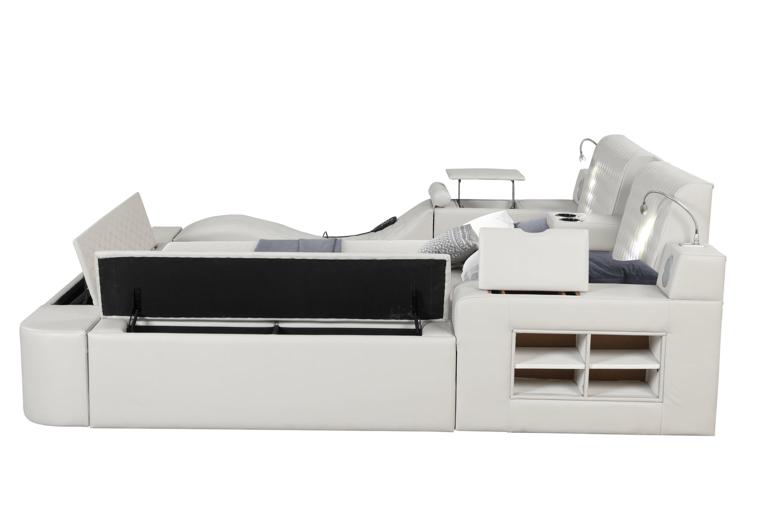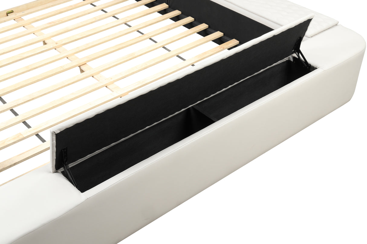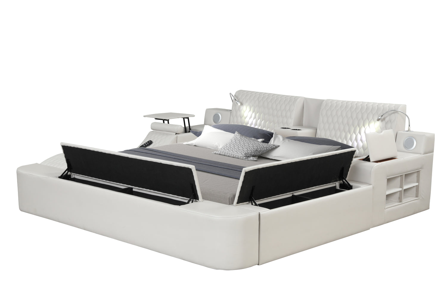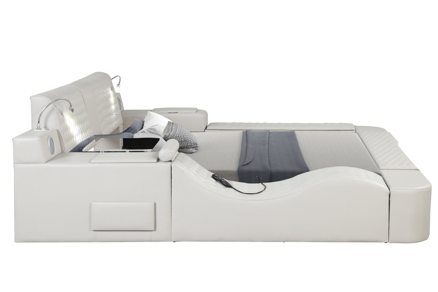 Esta cama futurista es el sistema de alojamiento definitivo con todo lo que necesitas en una habitación, TODO EN UNO. Su diseño ultraurbano es la opción perfecta para realzar tu dormitorio. Masajes, altavoces, luces de lectura, almacenamiento, comodidad... Esta cama lo tiene todo. Si quieres disfrutar de un masaje en tu dormitorio, el sillón de masaje con control remoto integrado te brindará una experiencia fantástica. El compartimento lateral y los cajones con barandillas son increíblemente prácticos para guardar libros, revistas o cualquier otro artículo esencial. Los altavoces Bluetooth integrados son ideales y te alegrarán el día. Con una estación de carga integrada con puertos USB, ¡ya no tendrás que levantarte de la cama! Las luces de lectura a ambos lados te acompañarán en tus sesiones de estudio o lectura nocturna con tu pareja. El cabecero está acolchado y acolchado para máxima comodidad. La estructura está hecha de madera de ingeniería para una calidad duradera. Este moderno espacio de juego para adultos es revolucionario por muchas razones. Con una sola compra, tendrás todo lo que necesitas a tu disposición. Disponible en colores hielo, negro y marrón en tamaños king y queen.