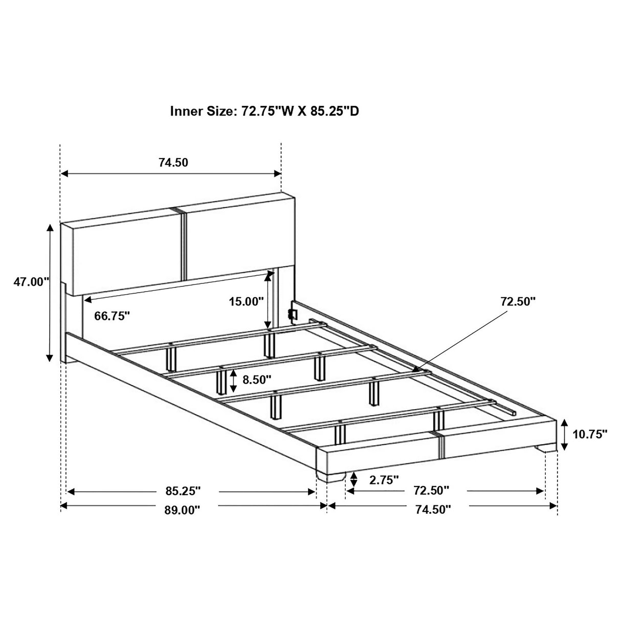 Cama California King: 74.50" de ancho x 90.00" de profundidad x 47.00" de alto