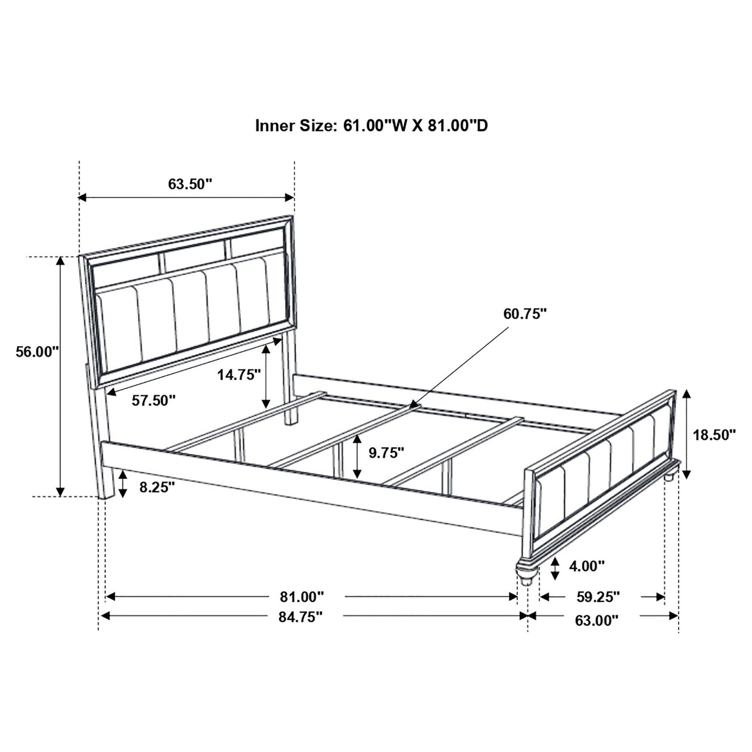 Cama Queen: 63,50" de ancho x 84,75" de profundidad x 56,00" de alto