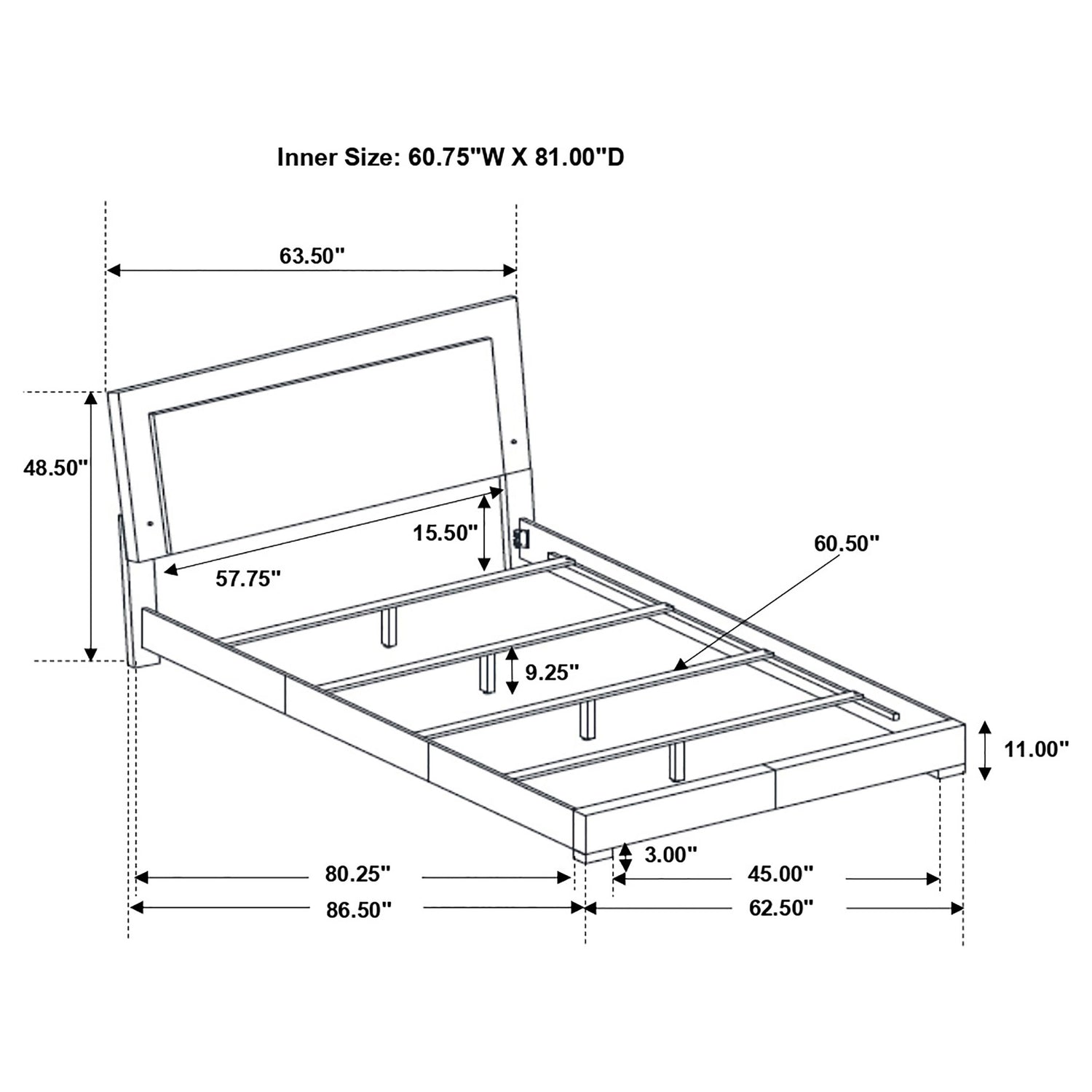Cama Queen: 63,50" de ancho x 86,50" de profundidad x 48,50" de alto