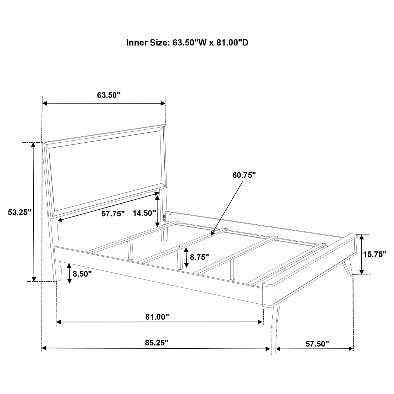 Cama Queen: 63,50" de ancho x 85,25" de profundidad x 53,25" de alto