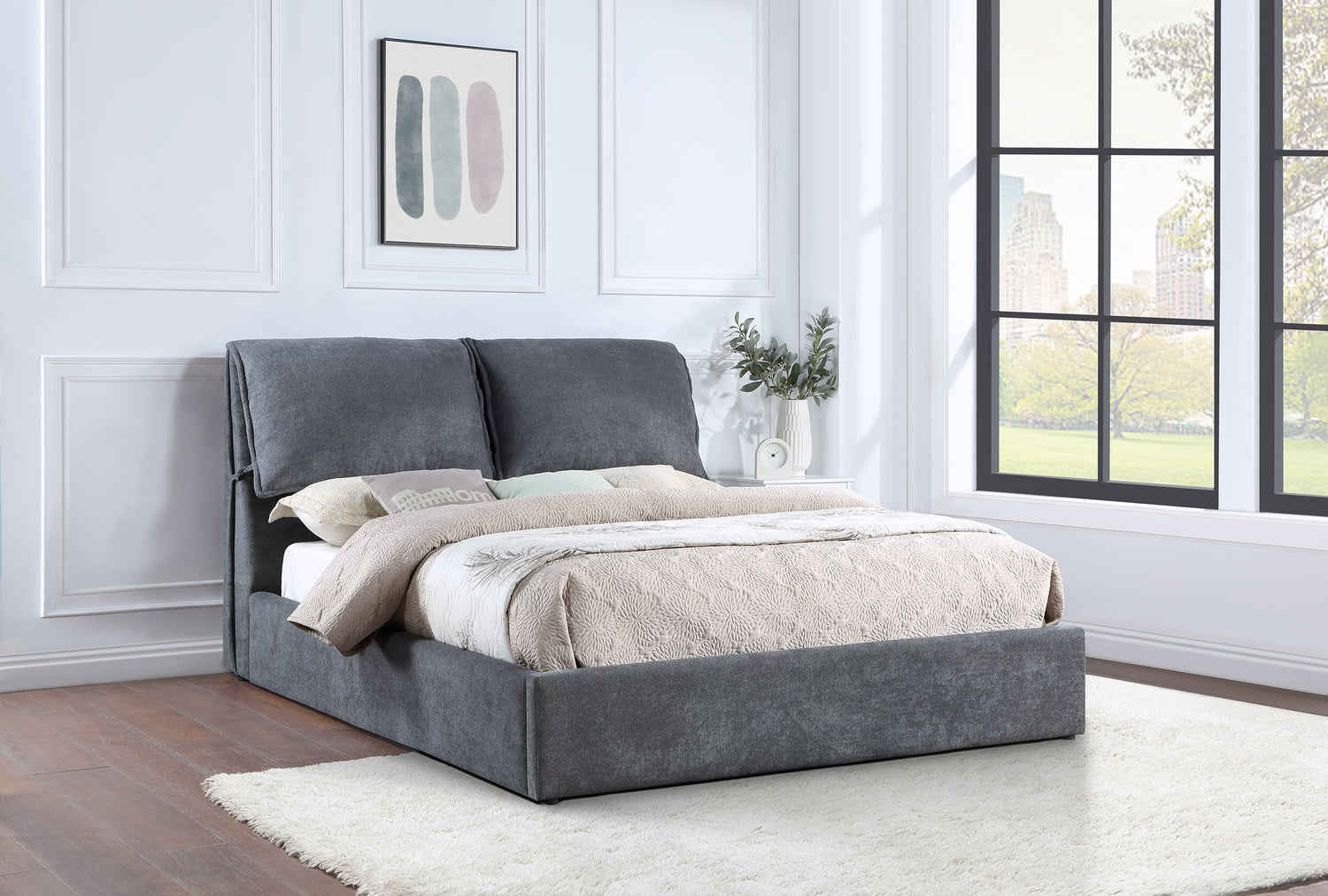 - Cama tapizada con líneas limpias y una silueta discreta para una simplicidad orgánica.