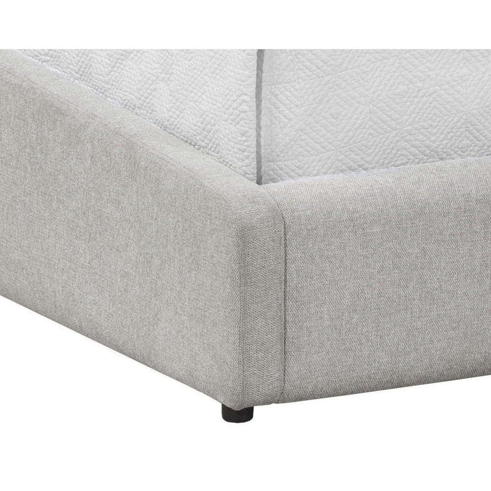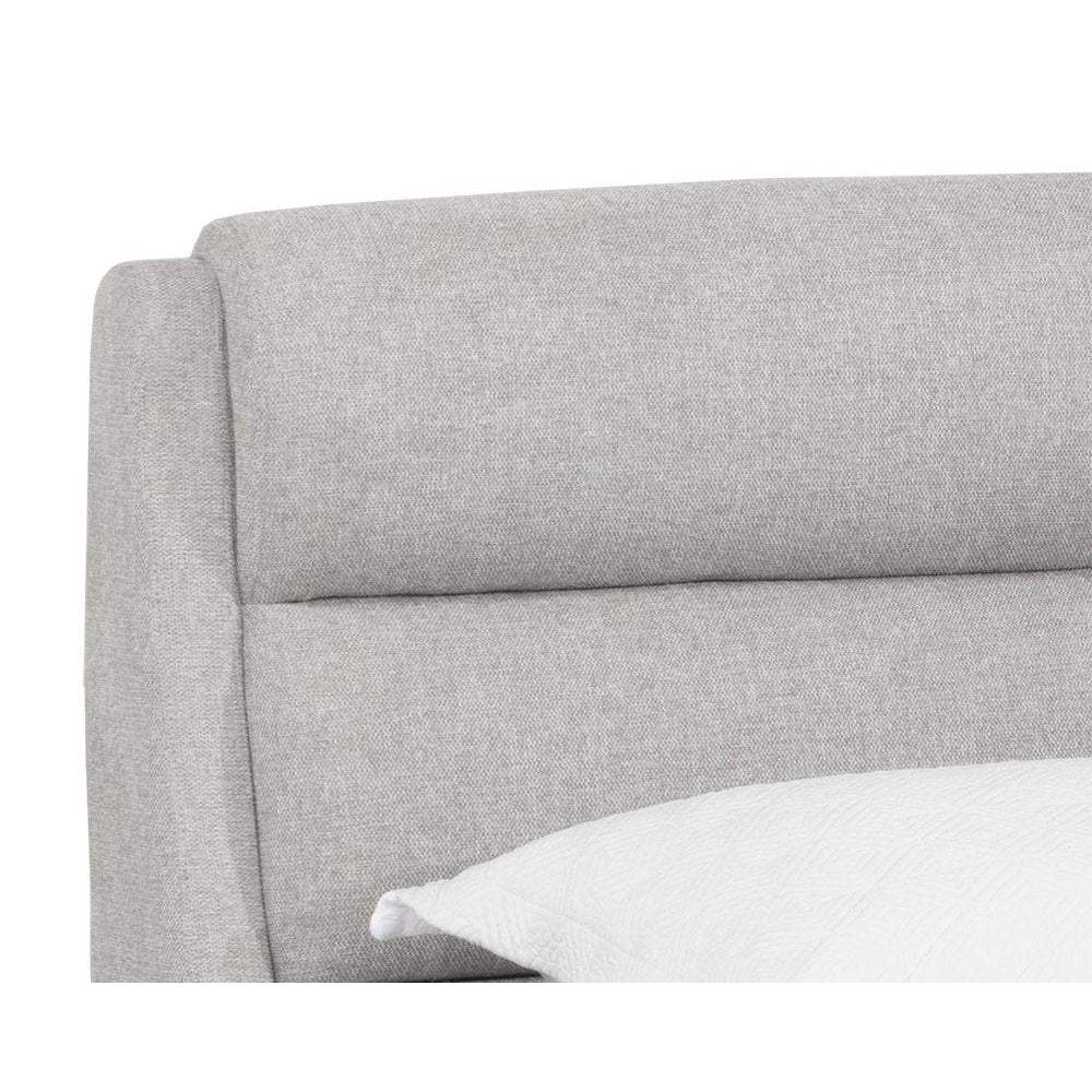 Esta cama tapizada presenta un diseño de cómodas curvas y capitoné con canales horizontales que le da un aspecto moderno. Está tapizada en tela Belfast gris jaspeado y cuenta con patas de madera maciza de caucho. No requiere somier y se incluyen láminas.