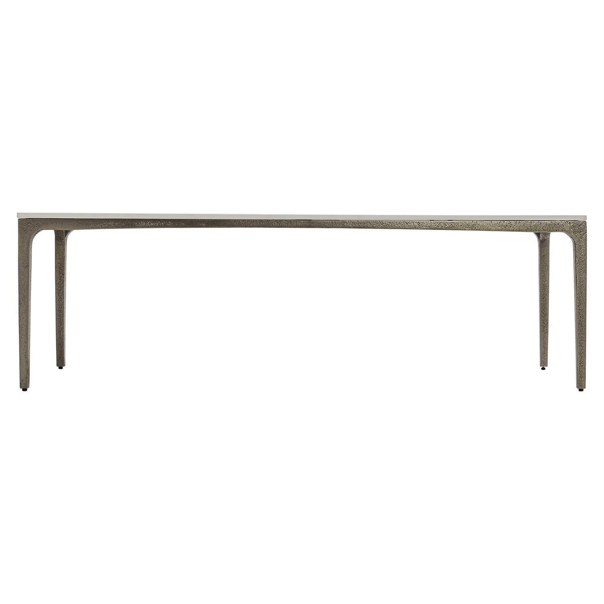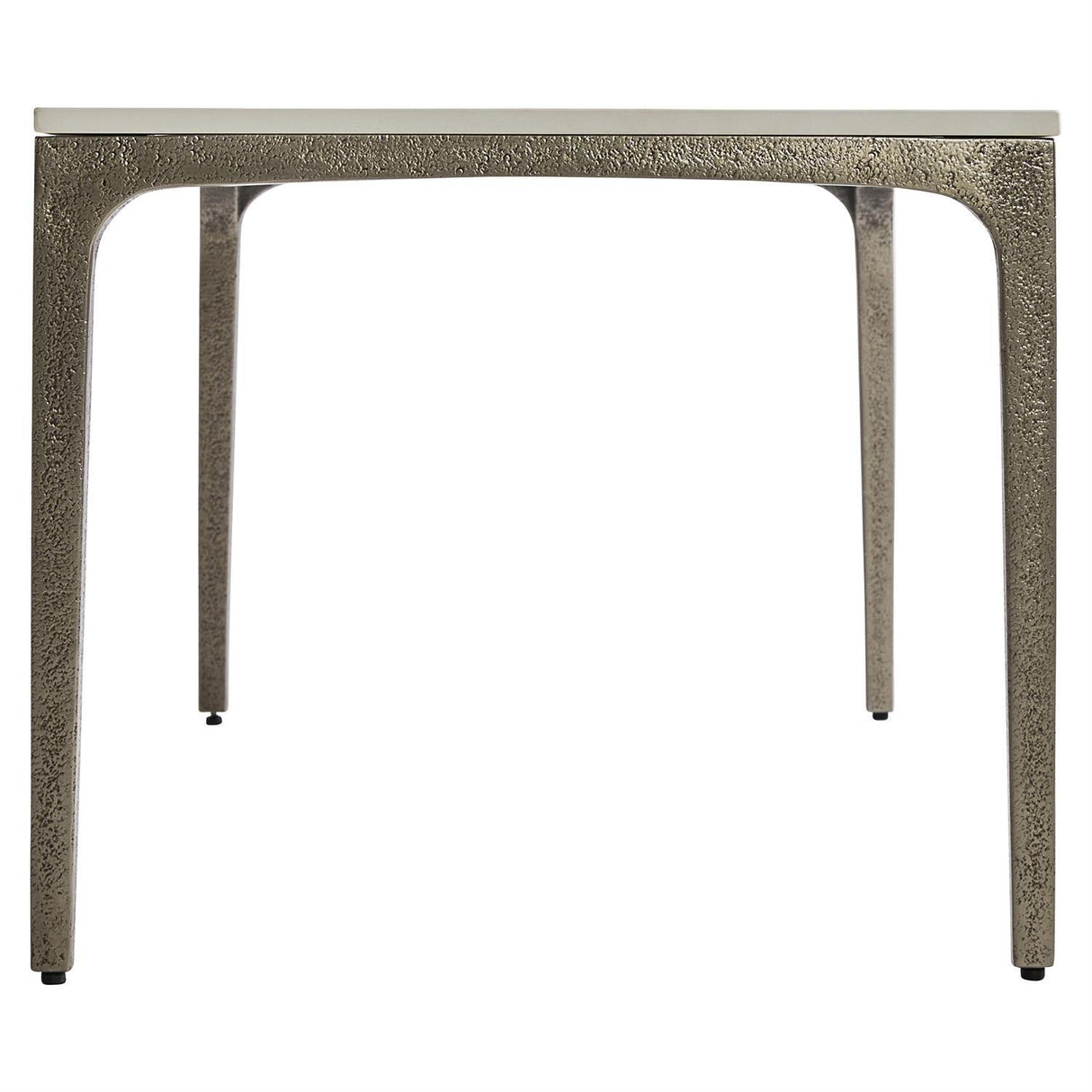 - Una forma esbelta en un marco de metal sostiene una tapa de piedra Dekton en esta mesa de cóctel.