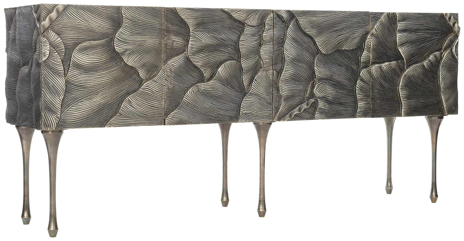 Bernhardt Interiors presenta el aparador Flora Entertainment , una impresionante fusión de textura metálica y elegancia botánica. Revestido a mano en plata alemana con un acabado en plata antigua , este aparador de 183 cm luce un elegante motivo floral que se extiende a lo largo de sus cuatro puertas de cierre suave. Diseñado para cautivar desde cualquier ángulo, ofrece una solución funcional y elegante para el almacenamiento de equipos multimedia o el comedor.
