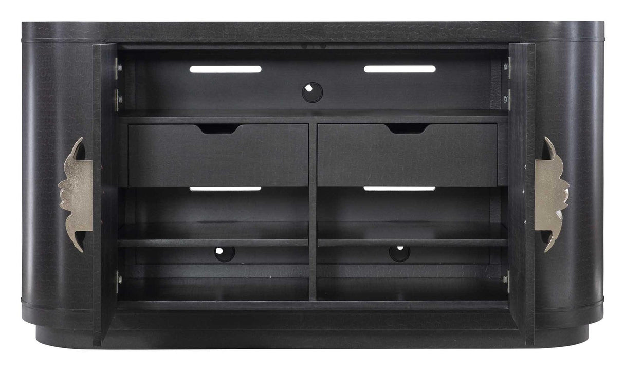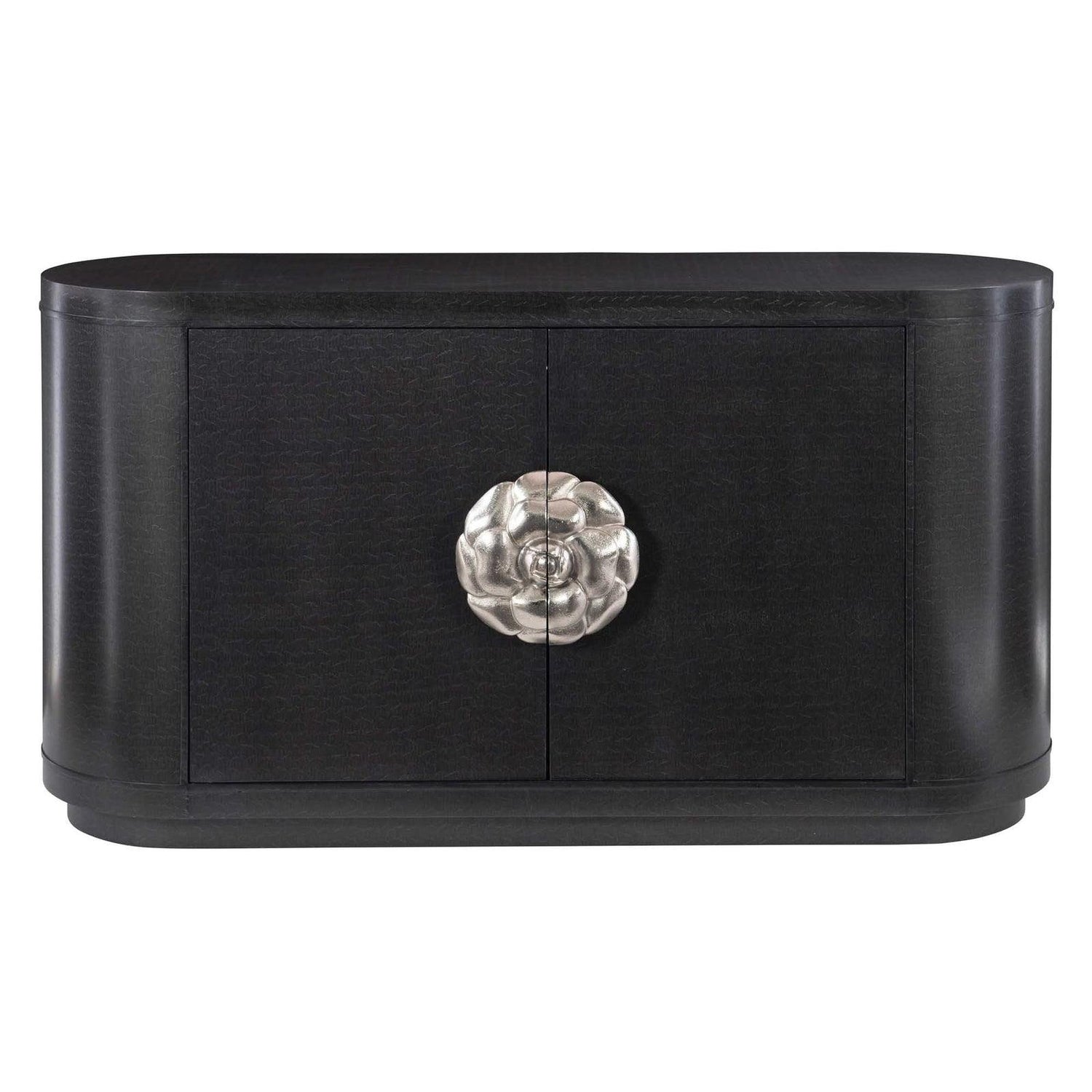 Bernhardt combina un diseño atemporal con la elegancia de la Regencia de Hollywood en el aparador Silhouette de 157 cm . Caracterizado por su rico acabado en ónix figurado y un espectacular tirador de aluminio fundido en forma de flor , esta pieza destaca tanto por su capacidad de almacenamiento como por su diseño llamativo. Con su silueta curva, su elegante base de zócalo y su sistema de gestión de cables integrado, es tan funcional como atractivo, ideal para salas de estar, comedores o espacios de entretenimiento con estilo.