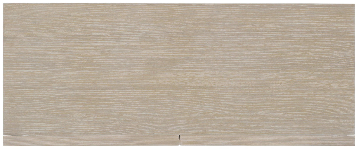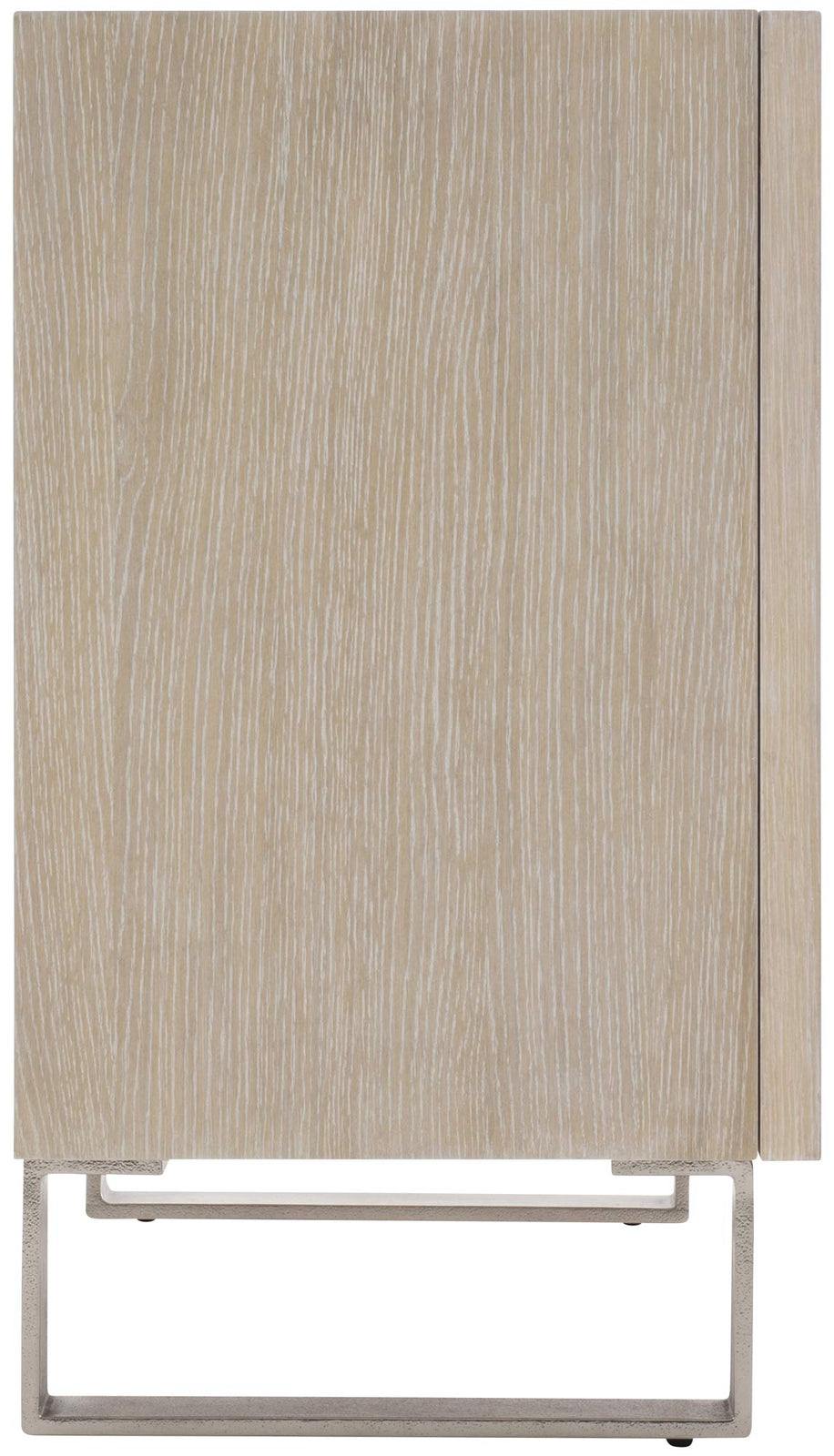Fabricado con madera maciza de fresno cuarteada y chapa de roble blanco cuarteada en acabado Dune. Cuenta con patas de aluminio fundido con acabado níquel brillante pulido. Las puertas presentan revestimientos de madera que le confieren un diseño geométrico y arquitectónico.