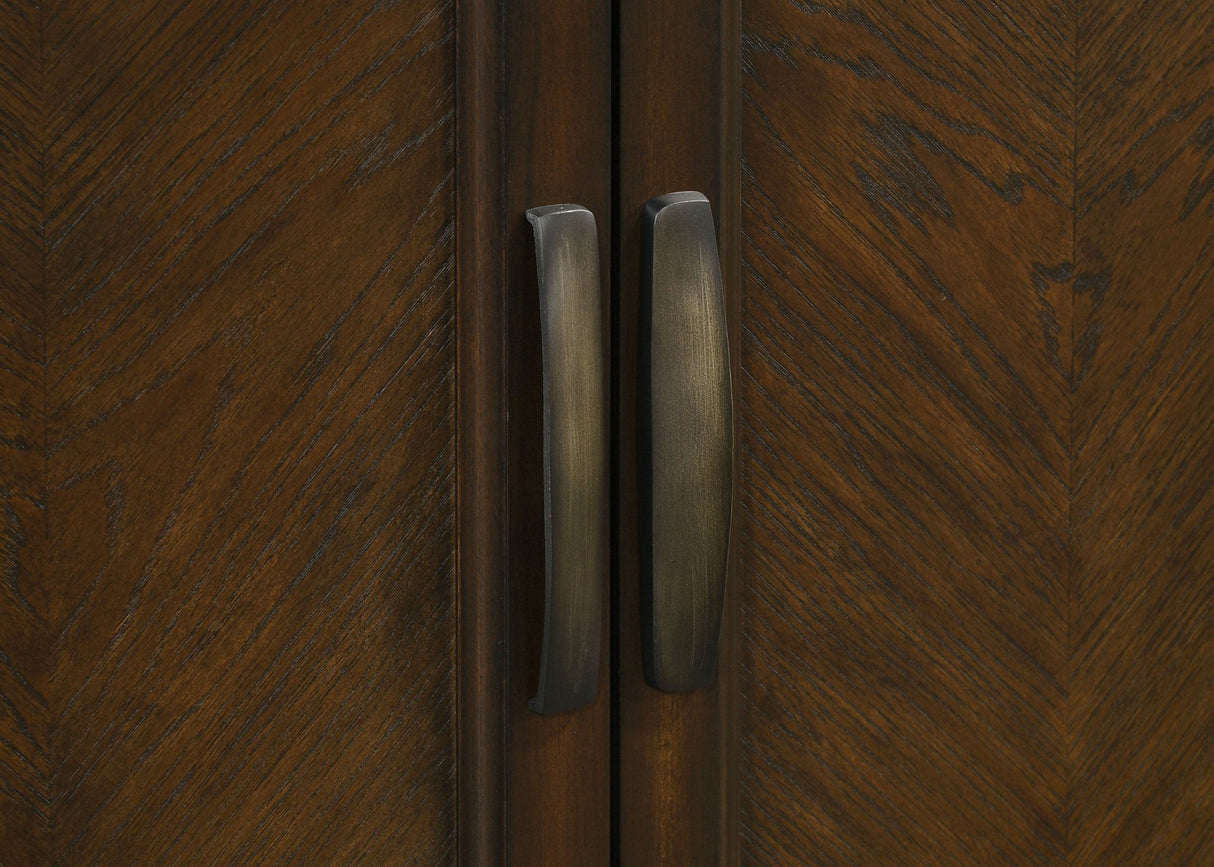 - Acabado en madera de nogal oscuro con tiradores de puerta con acabado metalizado.