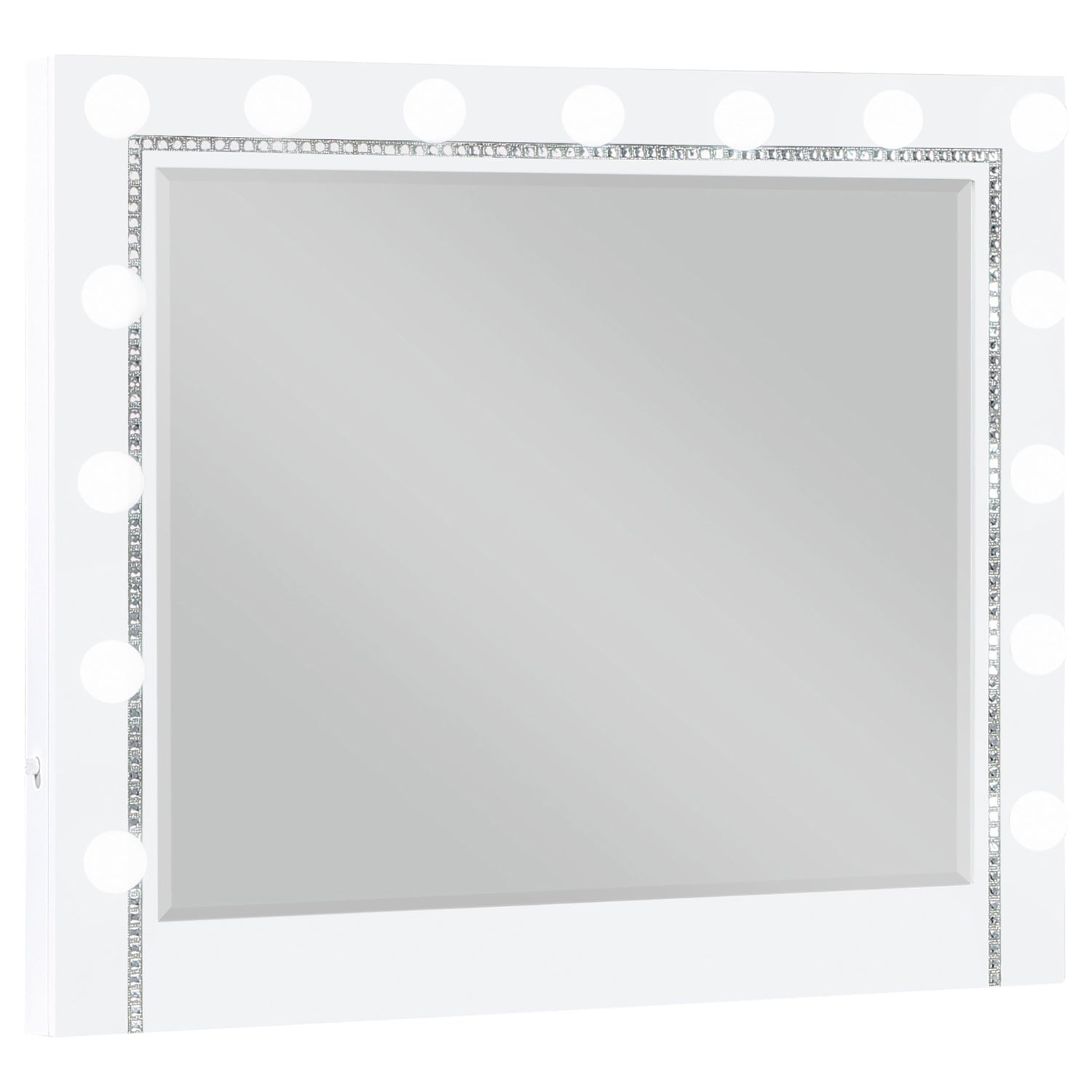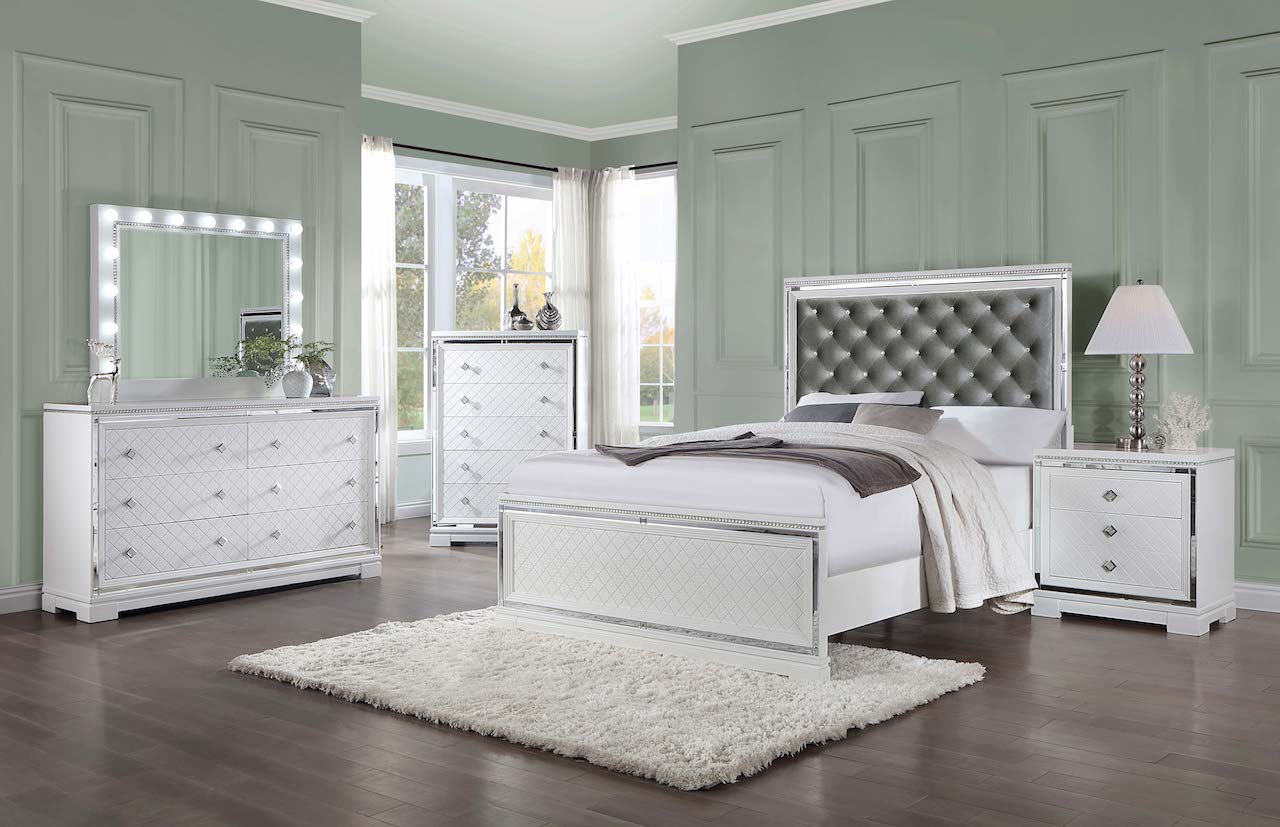 Elegancia discreta y detalles de lujo se combinan para crear este glamuroso juego de dormitorio de cinco piezas. Rematado con bordes de azulejos con incrustaciones de espejo y brillantes botones acrílicos en un reposacabezas acolchado de terciopelo plateado, cada pieza esencial del dormitorio crea una decoración espectacular para un remanso de paz. Al observar de cerca el brillante acabado, emergen sutiles patrones en relieve, revelando un doble estampado de diamantes y cocodrilo en el pie de cama y los paneles de los cajones. Sobre la cómoda se encuentra un amplio espejo con marco adornado con 15 bombillas expuestas que ofrecen una iluminación uniforme para aplicar maquillaje y peinar el cabello. Este glamuroso juego de dormitorio también ofrece toques modernos como tomas de corriente USB y cajones superiores forrados en suave fieltro para guardar delicadas piezas de vestuario y joyas.