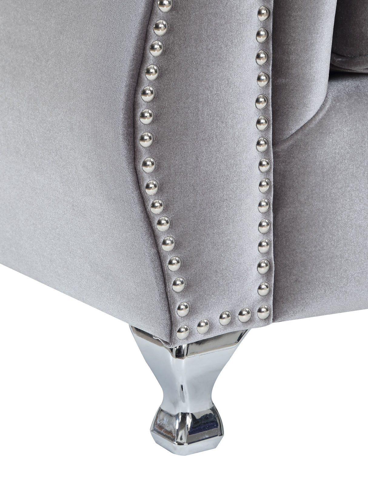 - Elegantes brazos enrollados acentuados con tachuelas cromadas colocadas individualmente