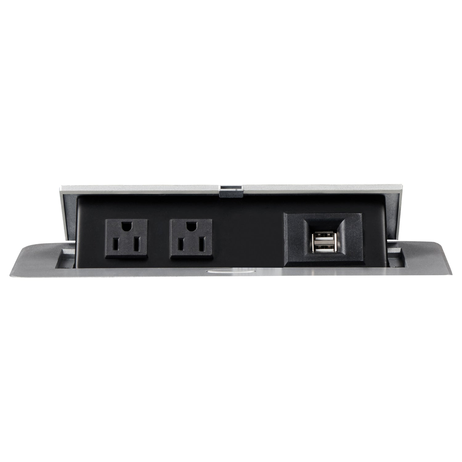 • El sofá cuenta con una mesa abatible con toma de corriente emergente (2 CA/2 USB), dos (2) portavasos y un cajón de almacenamiento.