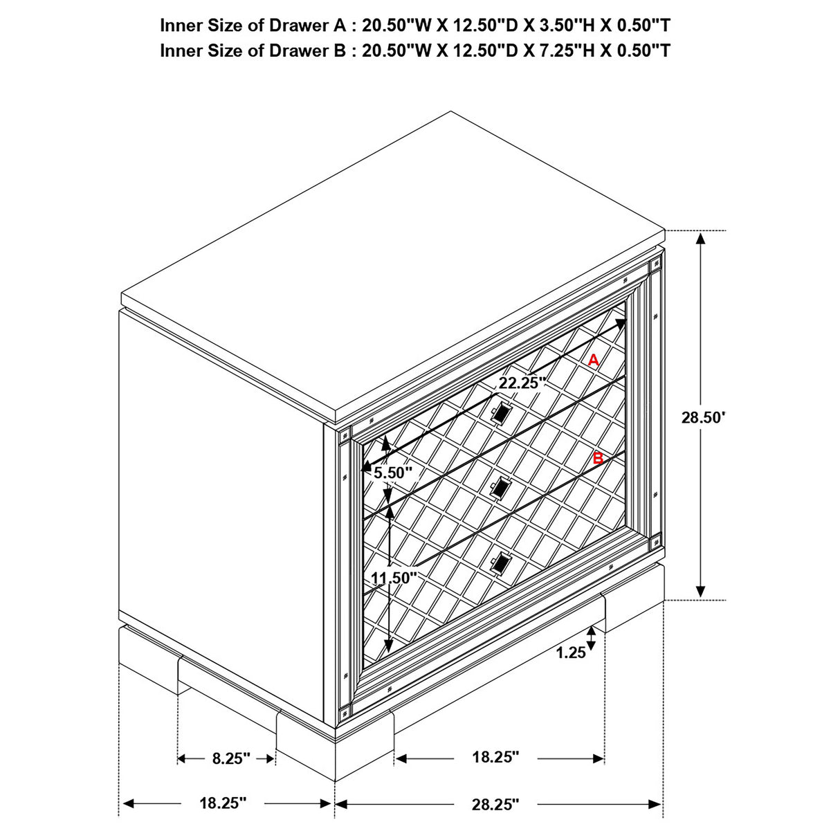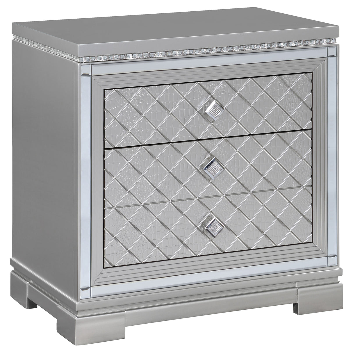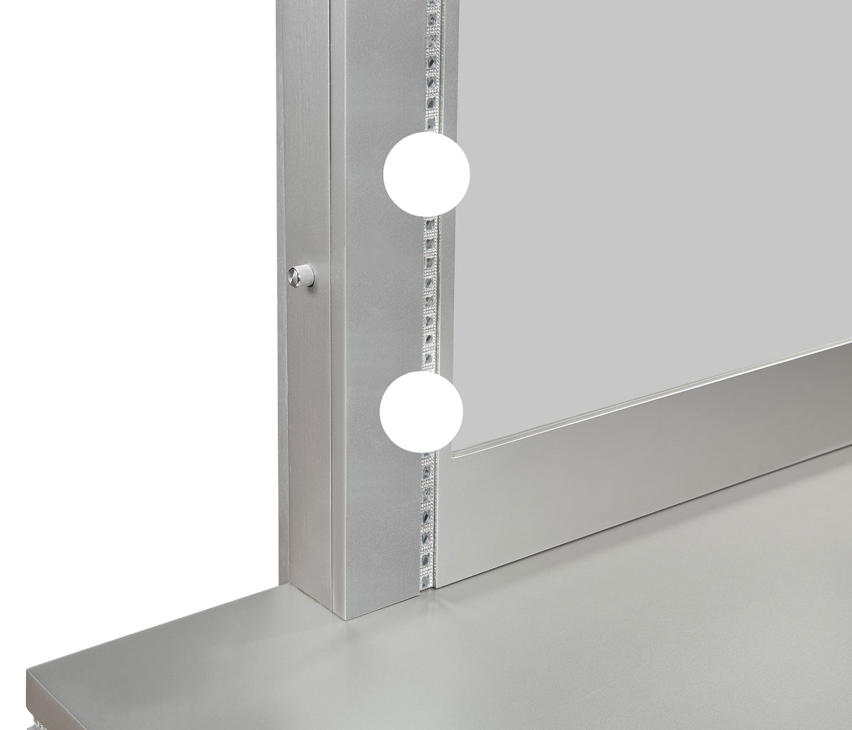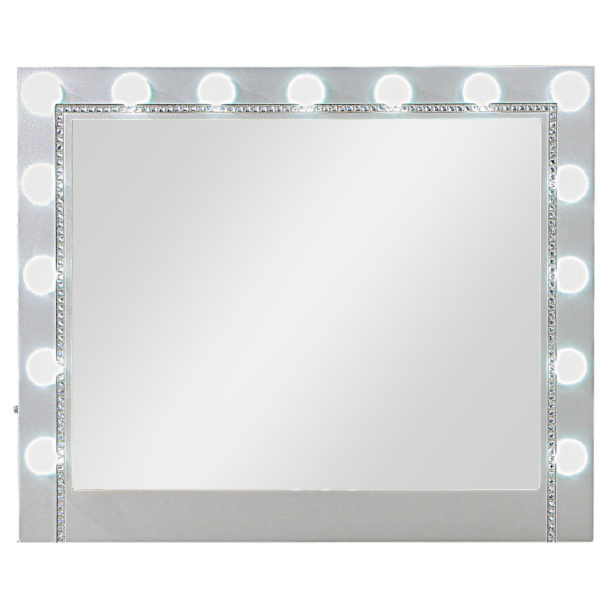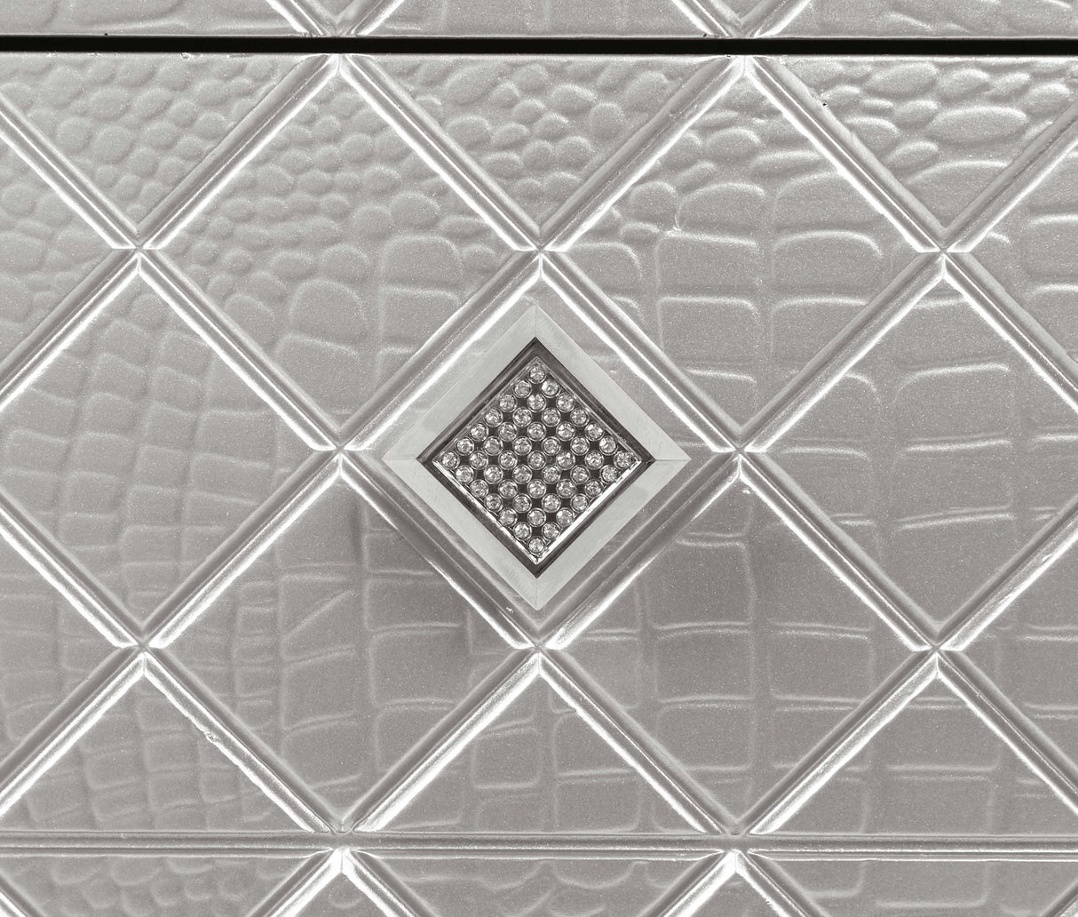 Elegancia discreta y detalles de lujo se combinan para crear este glamuroso juego de dormitorio de cinco piezas. Rematado con bordes de azulejos con incrustaciones de espejo y brillantes botones acrílicos en un reposacabezas acolchado de terciopelo plateado, cada pieza esencial del dormitorio crea una decoración espectacular para un remanso de paz. Al observar de cerca el brillante acabado, emergen sutiles patrones en relieve, revelando un doble estampado de diamantes y cocodrilo en el pie de cama y los paneles de los cajones. Sobre la cómoda se encuentra un amplio espejo con marco adornado con 15 bombillas expuestas que ofrecen una iluminación uniforme para aplicar maquillaje y peinar el cabello. Este glamuroso juego de dormitorio también ofrece toques modernos como tomas de corriente USB y cajones superiores forrados en suave fieltro para guardar delicadas piezas de vestuario y joyas.