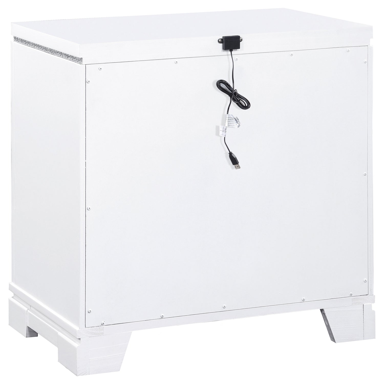 Elegancia discreta y detalles de lujo se combinan para crear este glamuroso juego de dormitorio de cinco piezas. Rematado con bordes de azulejos con incrustaciones de espejo y brillantes botones acrílicos en un reposacabezas acolchado de terciopelo plateado, cada pieza esencial del dormitorio crea una decoración espectacular para un remanso de paz. Al observar de cerca el brillante acabado, emergen sutiles patrones en relieve, revelando un doble estampado de diamantes y cocodrilo en el pie de cama y los paneles de los cajones. Sobre la cómoda se encuentra un amplio espejo con marco adornado con 15 bombillas expuestas que ofrecen una iluminación uniforme para aplicar maquillaje y peinar el cabello. Este glamuroso juego de dormitorio también ofrece toques modernos como tomas de corriente USB y cajones superiores forrados en suave fieltro para guardar delicadas piezas de vestuario y joyas.