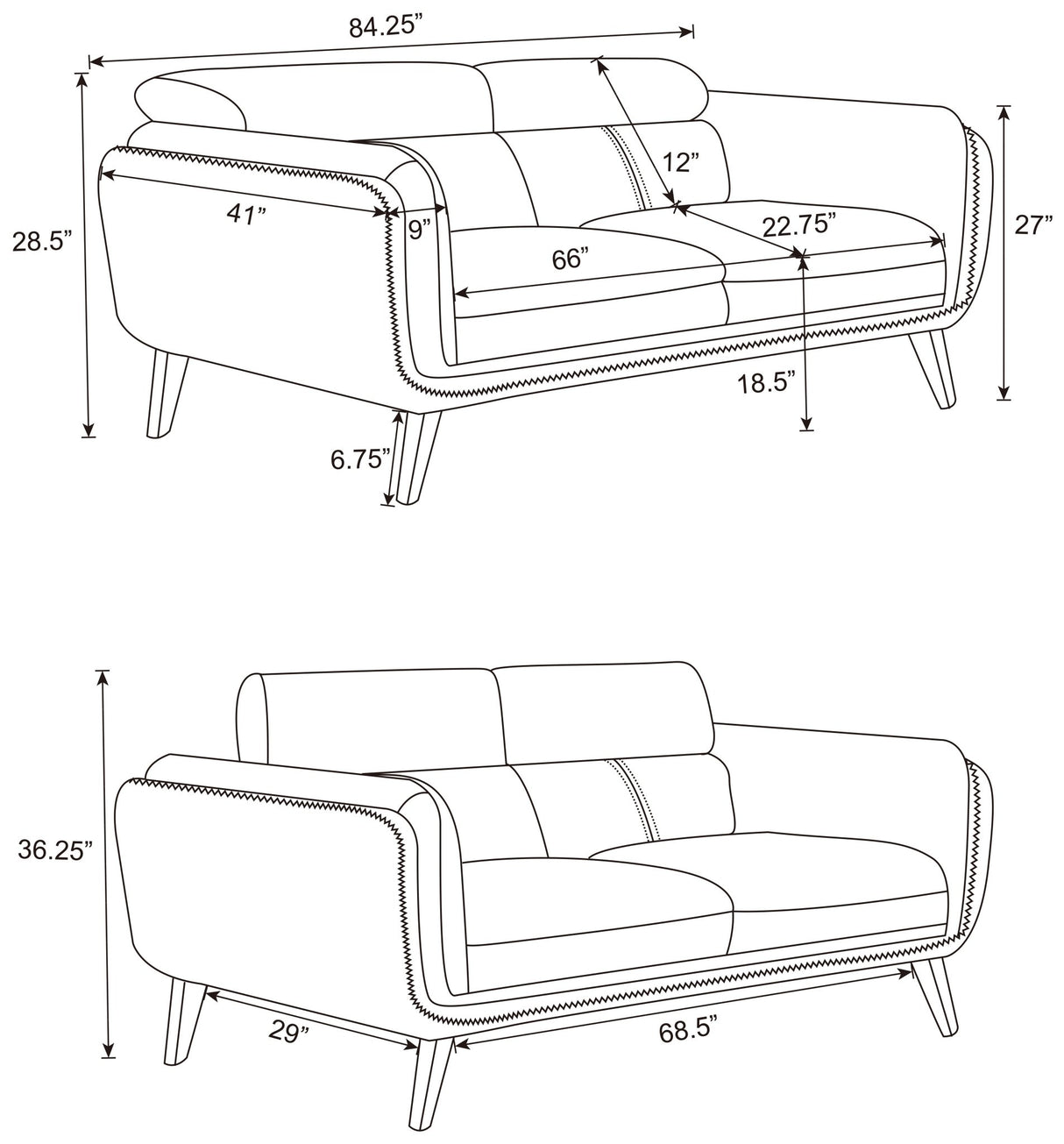 Completa tu sala de estar o área de entretenimiento con este conjunto de sofás contemporáneos de inspiración esmoquin. Relájate en los lujosos cojines del asiento, entre los brazos acolchados de doble riel, al final de un largo día. Los respaldos altos con soporte lumbar también ofrecen una cómoda forma de relajarse. Las patas cónicas y acampanadas con acabado marrón oscuro se asoman desde abajo de forma espectacular, en un guiño al diseño moderno de mediados de siglo de la estructura. Por último, el bordado de cruz y el pespunte en blanco aportan el toque final y un toque de contraste.
